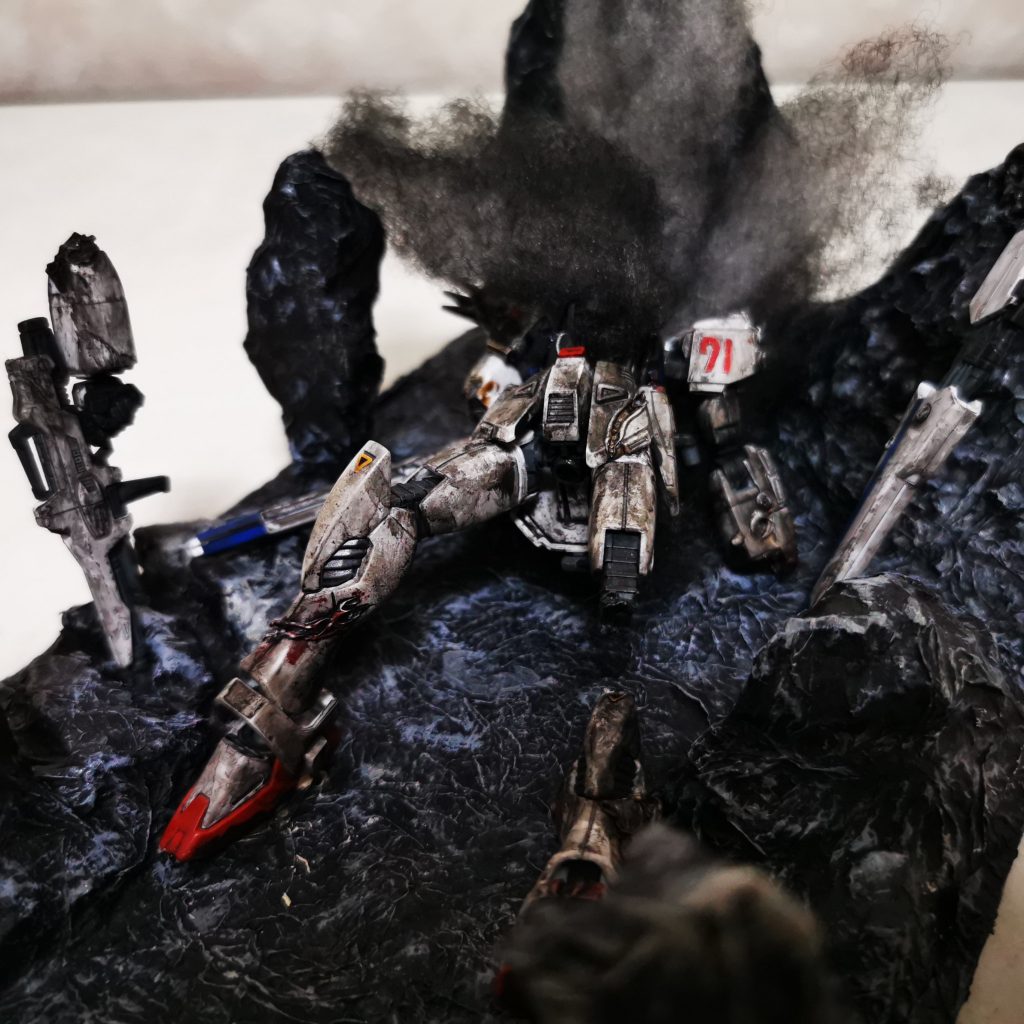 肩の切断、左脚の破損、両腕の破損、頭部・胴体の破損を半だごてとウェザリングで再現しました。