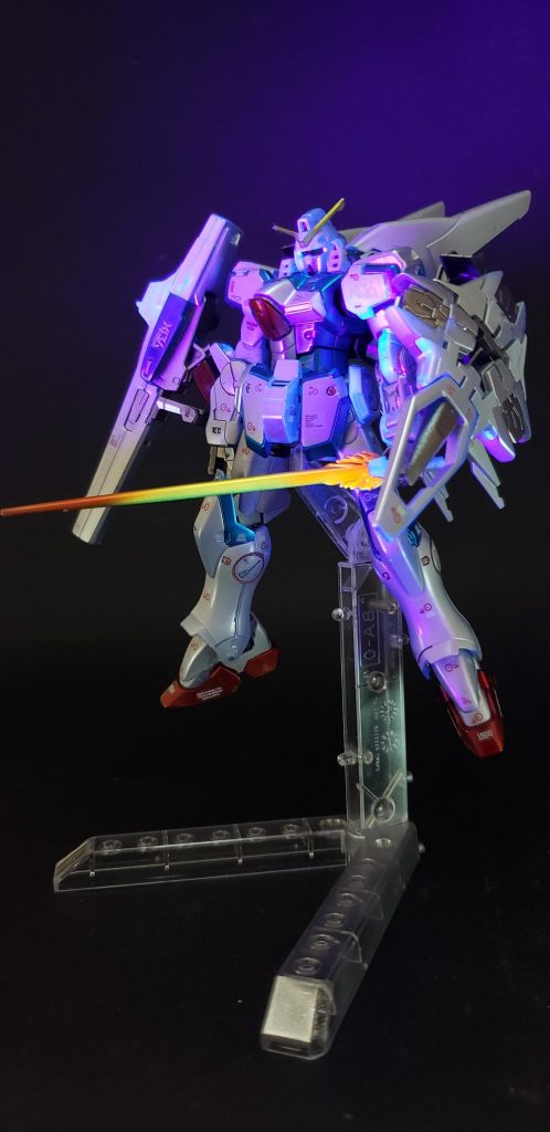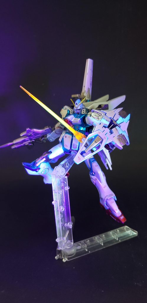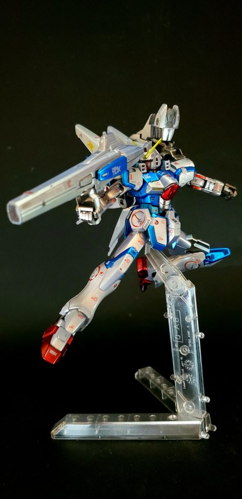 ![また、Aパーツ、Bパーツ、Cパーツやコアファイターに分離することも可能で、そこにミノフスキー・シールドやメガビーム・キャノンをウェポンプラットフォームを介して水平に装着可能[109]。3倍ほどにもなったメイン・エンジンの出力[112]によってテール・ノズルと補助スラスターが強化、肩と膝の装甲も大型化されている[113]が、フレームはVガンダムと同じであり、最大推力を出すと機体が分解することが作中で示唆されている[114]。](https://gumpla.jp/wp-content/uploads/2020/11/20201114_223140-498x1024.jpg)