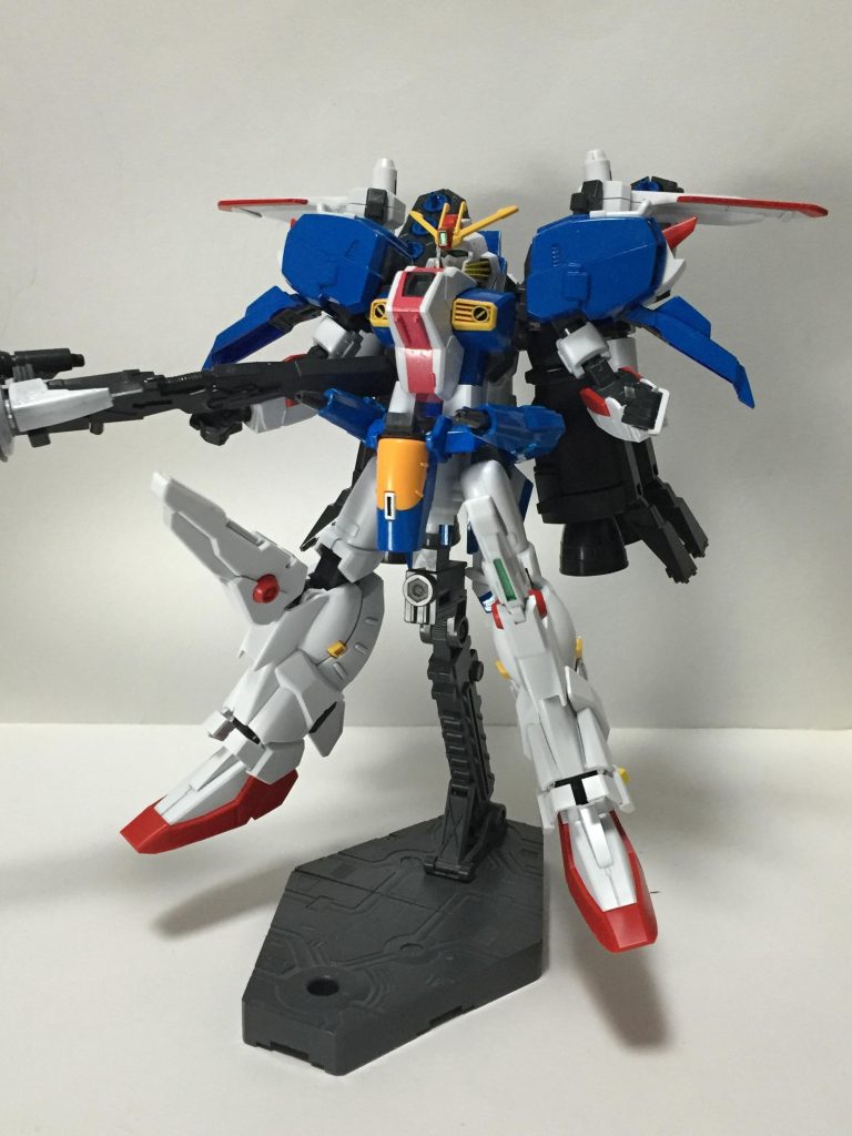 この機体完成させるのは良いんですが、スタンドがないと自立しないというデメリットがありました。なにせバックパックは重いし左膝のポリキャップはゆるゆるだし、仕方ないのでスタンドで自立させようにもスタンド穴がないのでプラ板を接着しピンバイスで穴を開けスタンド穴を作りました………まあ旧キットだから仕方ないね