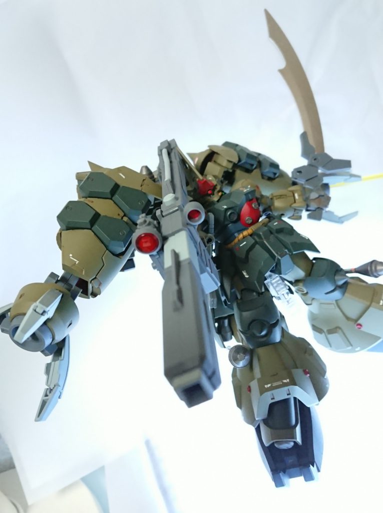 ミキシングされた頭部が素晴らしいのは勿論のこと、腰の動力パイプやシュツルム・ファウストを装備させる事で一気にジオンらしさが出ていますね!
