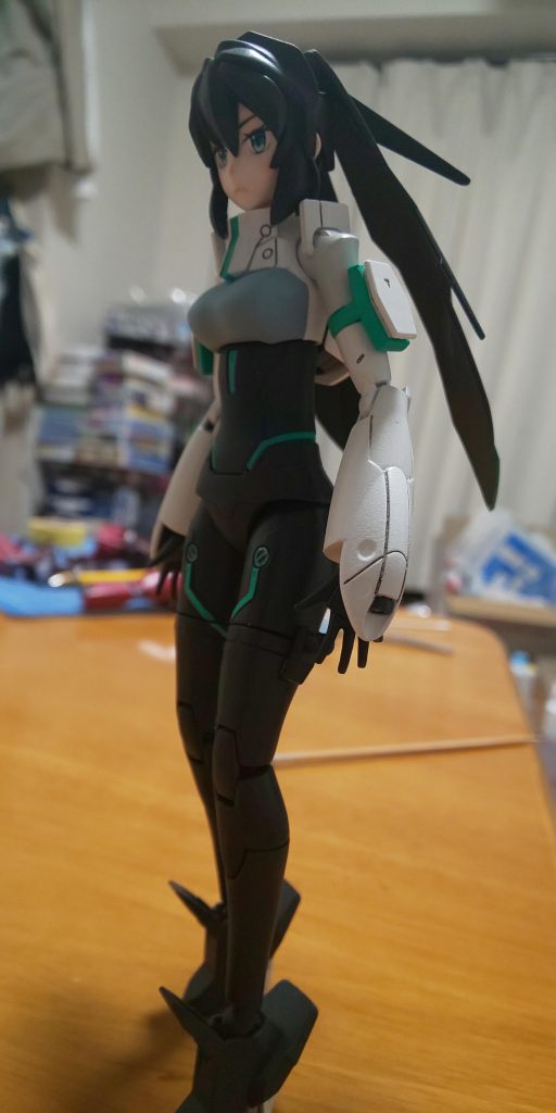 前髪をすこし削ってシャープにし、他はとくにストレートに組んで塗っただけですが、顔は可愛く見えるようにメイクしました。他の表情パーツがあまり好きじゃなかったのでこの顔だけしか作ってません。水性ホビーカラーで塗ったあとに、クリアがなかったので、ファレホのポリウレタンバーニッシュしてます。ポリウレタンバーニッシュは強度はあるけど、はげると、ボロっといきますね、、。下半身の可動が結構制限あるのでポージングがなかなか決まりませんがかわいいのでOKです