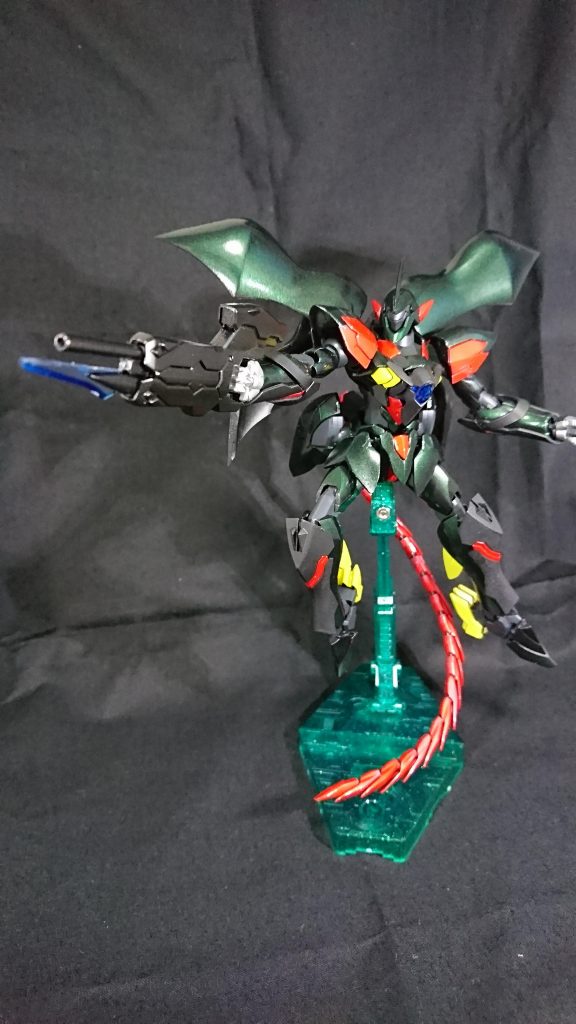ヴェイガン特有の生物感を出したかったので塗装は初のクリアカラー塗装になります。メインカラーは黒鉄色の上からクリアーで薄めたクリアグリーンを塗装して、ぱっと見は黒で光を当てると緑がでてくる色合いになっています。赤はシンプルにシルバーの上からクリアレッドで塗装、追加装甲の部分だけ別パーツを強調するためにつや消しにしています。