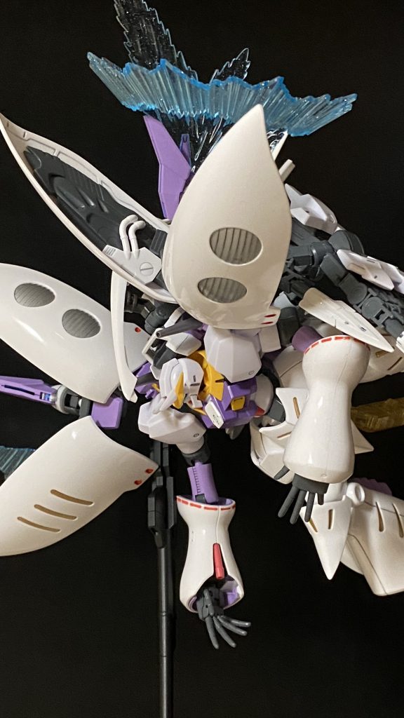 背中に見える髪のような物は、カウンターウエイトとしての役割を持つ。腰部には、GNファンネルとしてキュベレイのファンネルコンテナが確認できる。