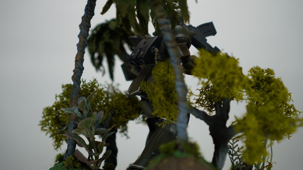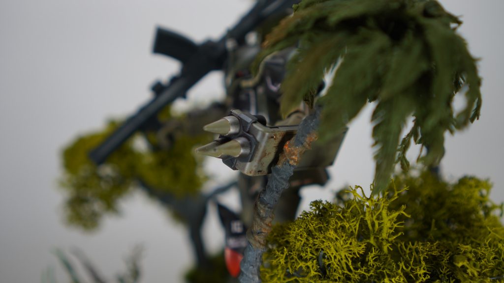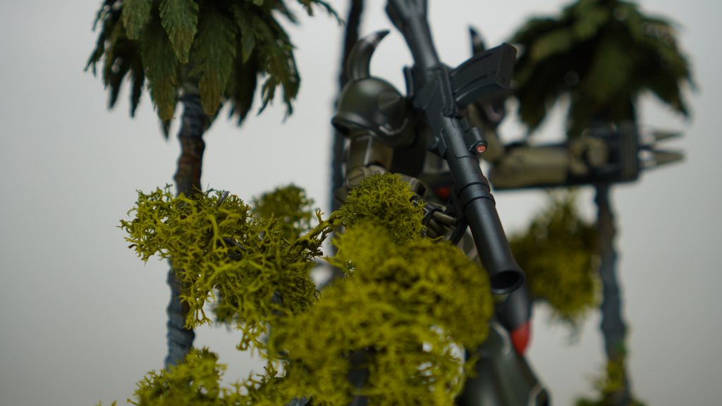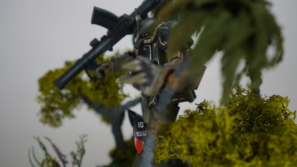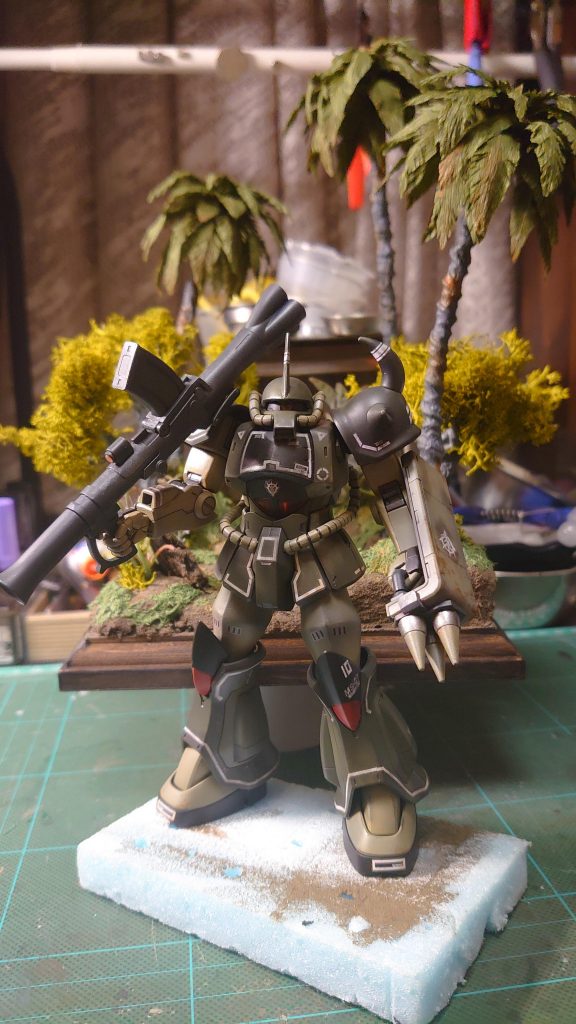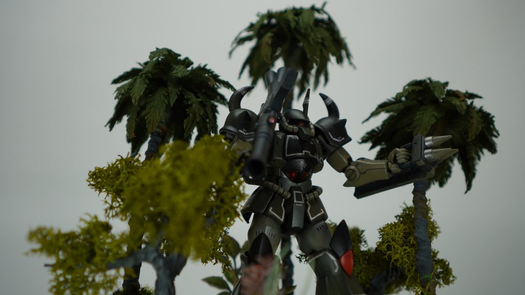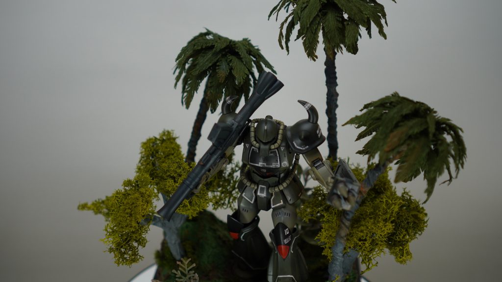 ファーストでジャブロー侵攻に参加してたグフは青だったけど、ジャングル戦なら間違いなくリアルタイプカラーの方が理にかなってますね。しかもトーンを更に抑えたこのカラーは状況に更にマッチしてますね!