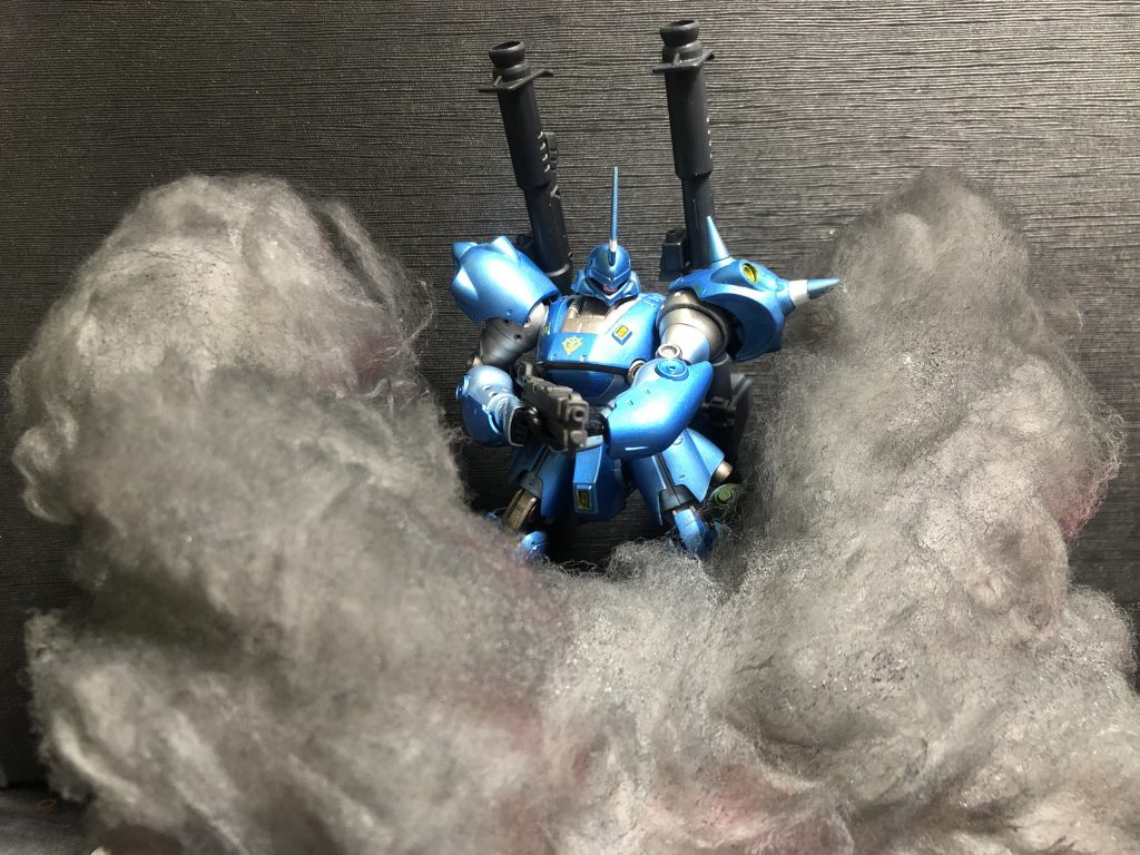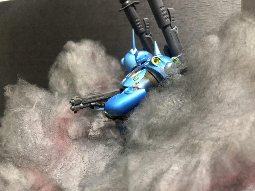 煙は綿で適当に形作ってエアブラシで色付け。かなり濃く塗らないと写真に撮った時に雲みたいになってしまうため何度かリテイクしました。