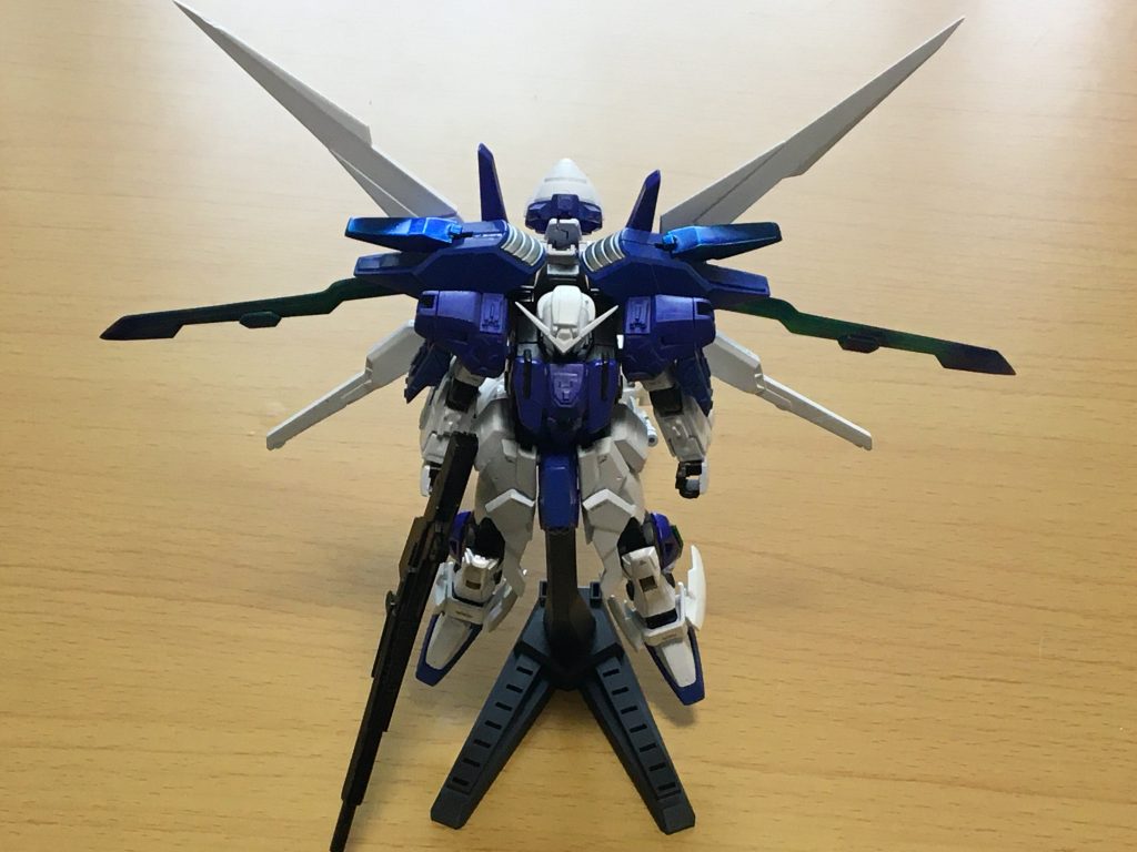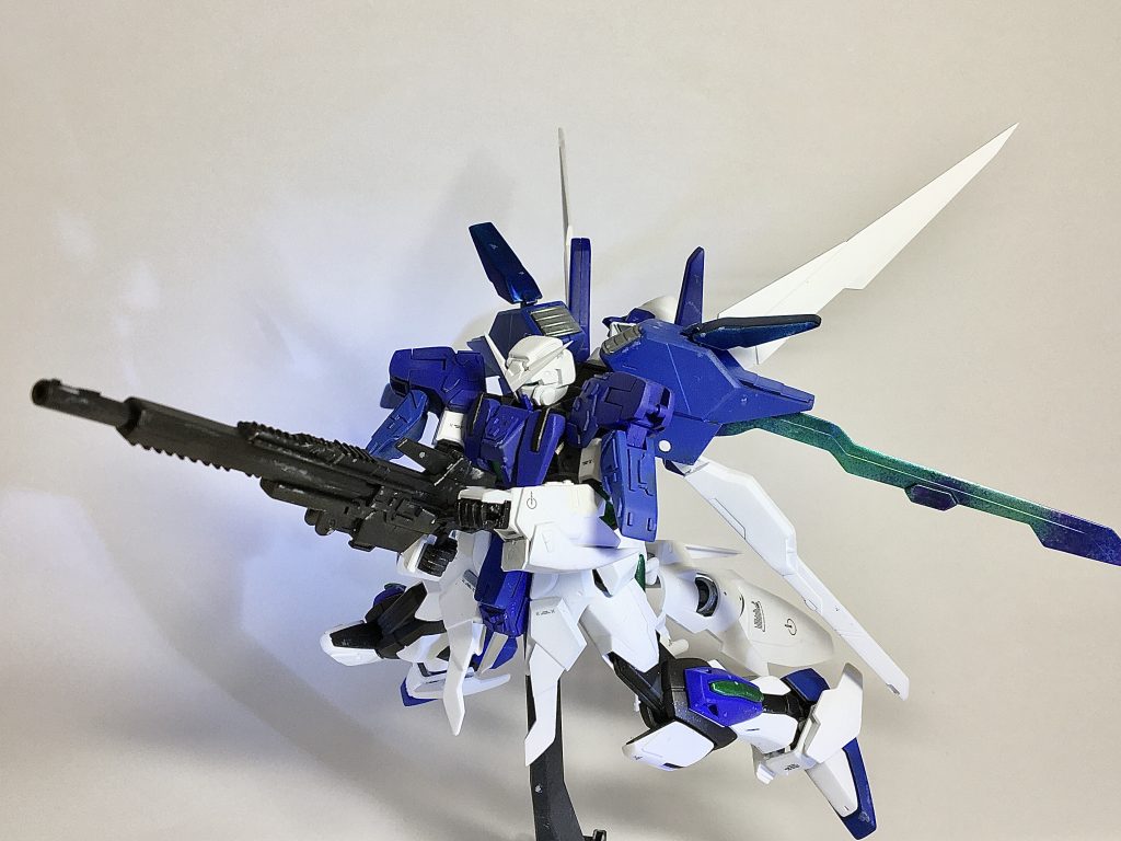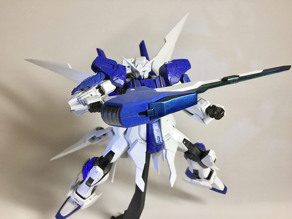 青と白を基調とした王道なデザインにしております。バックパックには太陽炉を搭載した可変式ウイングとGP03のテールバインダーを使用した高機動ユニットを装備しています。