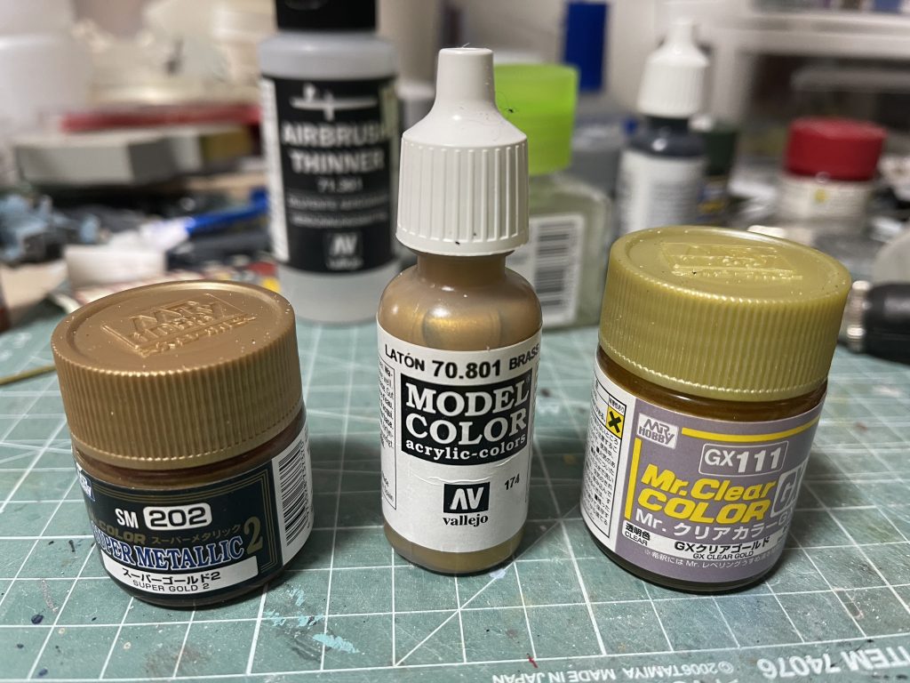 そのほか、比較用にMrカラーのスーパーゴールド2(SM202)、GXクリアゴールド(GX111)を部分的に使用。