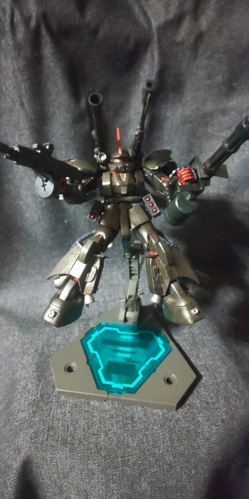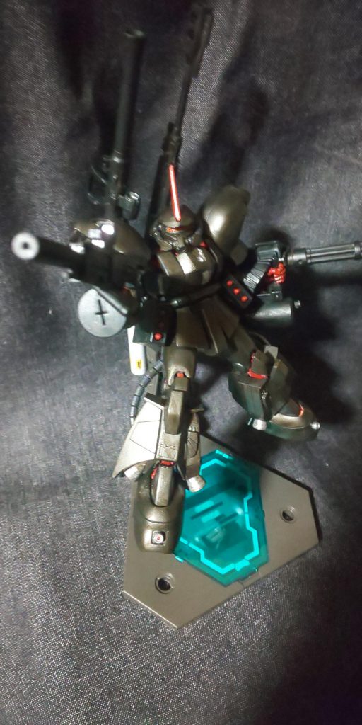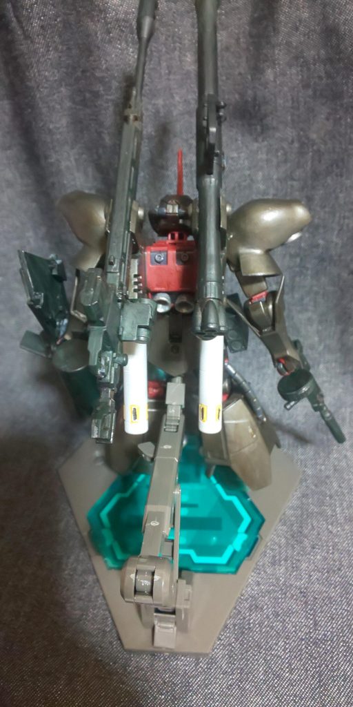コンセプトはザクを否定するザクです。肩アーマーをふくらはぎのパーツ、腕の装甲を脛のパーツを流用。新しく脚にジョニー・ライデン機のものを使いました。こちらは無加工で付けられました。バックパックもライデン機の脚部パーツを流用し、武器をマウントできるように加工し、プロペラントタンクを取り付け。腰に陸戦ザクのミサイルポッドを装備、ライフルはジェスタより。マガジンをドラムマガジンに変更。胸の装甲はポリパテでスクラッチし、頭部はモノアイからプラ板でセンサーアイに切り替え、頭部バルカンを設置、追加装甲を取り付けてマウスノズルにも手を入れました。