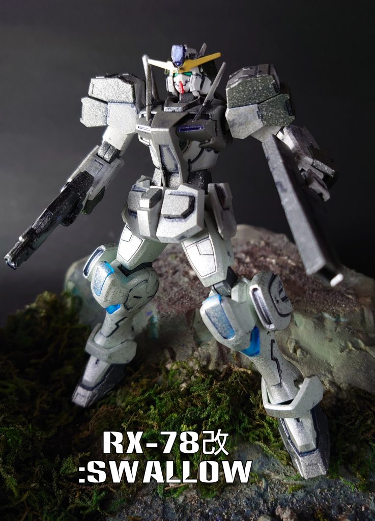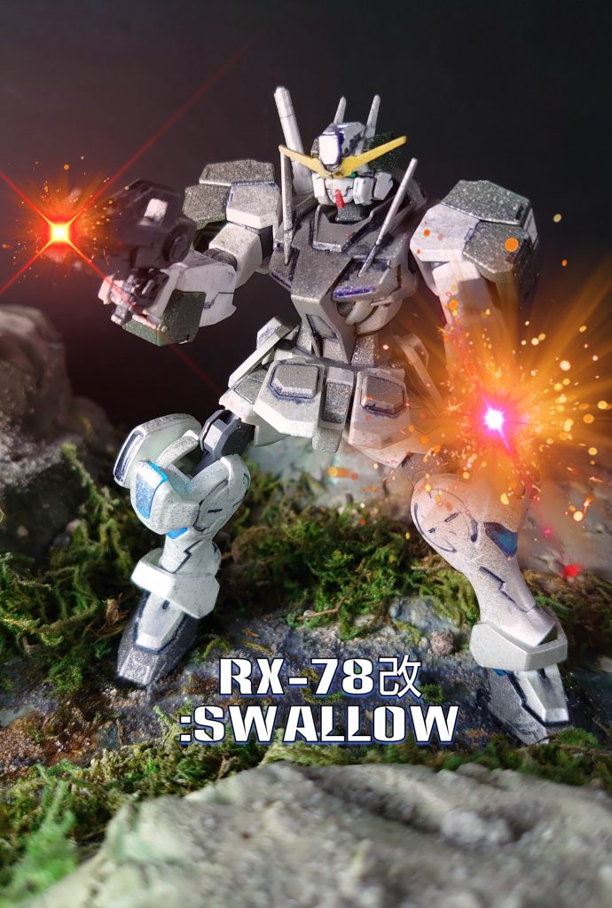 本機体は、RX-78改:Swallowである。脚部にメインスラスター及び補助スラスターを集約し、地上では規格外の機動力を発揮する。しかし、操縦性はピーキーなものになり、駆ける戦地において両手の小型ライフルで的確に射撃するためには、パイロットの高い技量が不可欠だ。