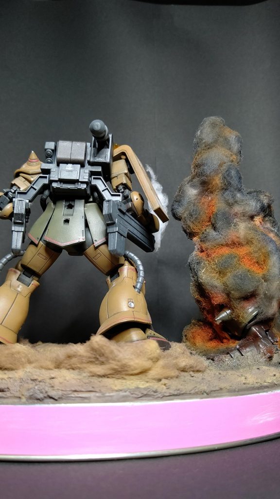スペースが寂しかった為、破壊され黒煙が立ち上るザクの上半身を置き、戦場の雰囲気を演出してみました。