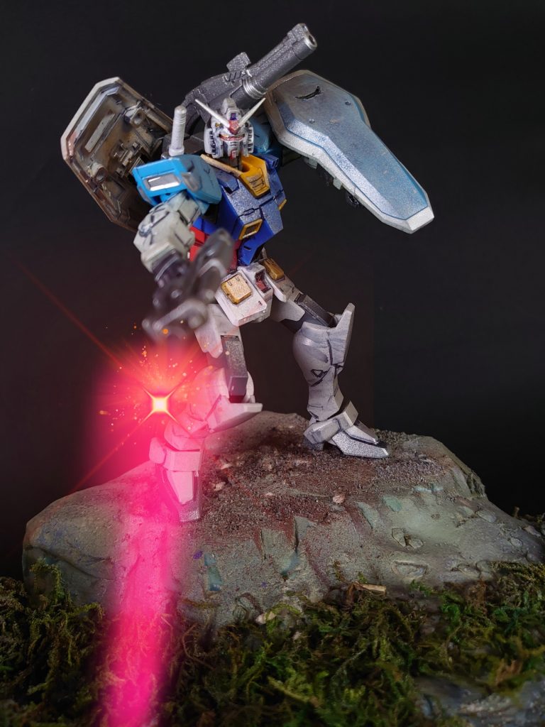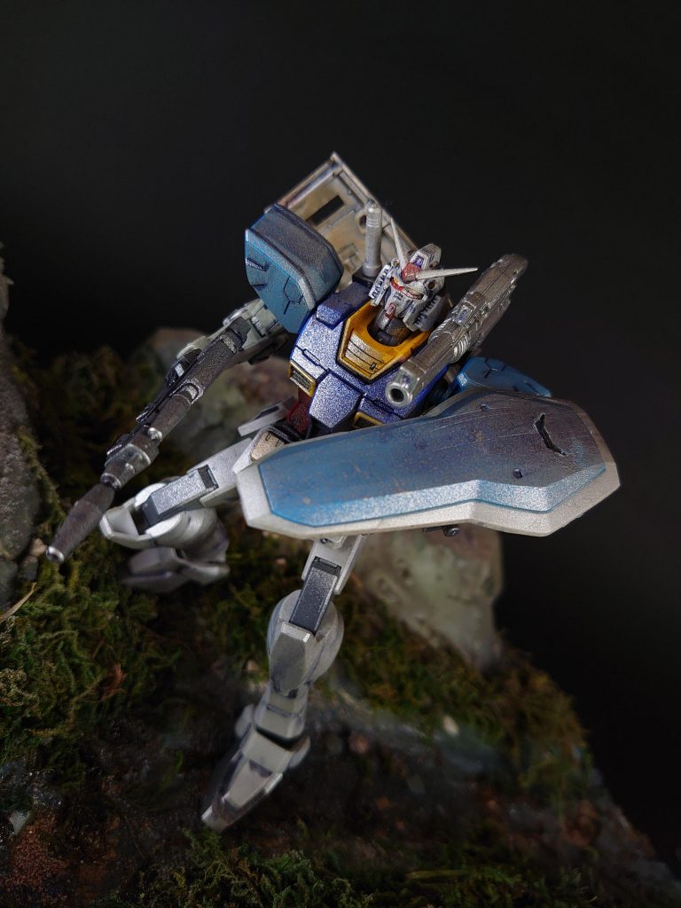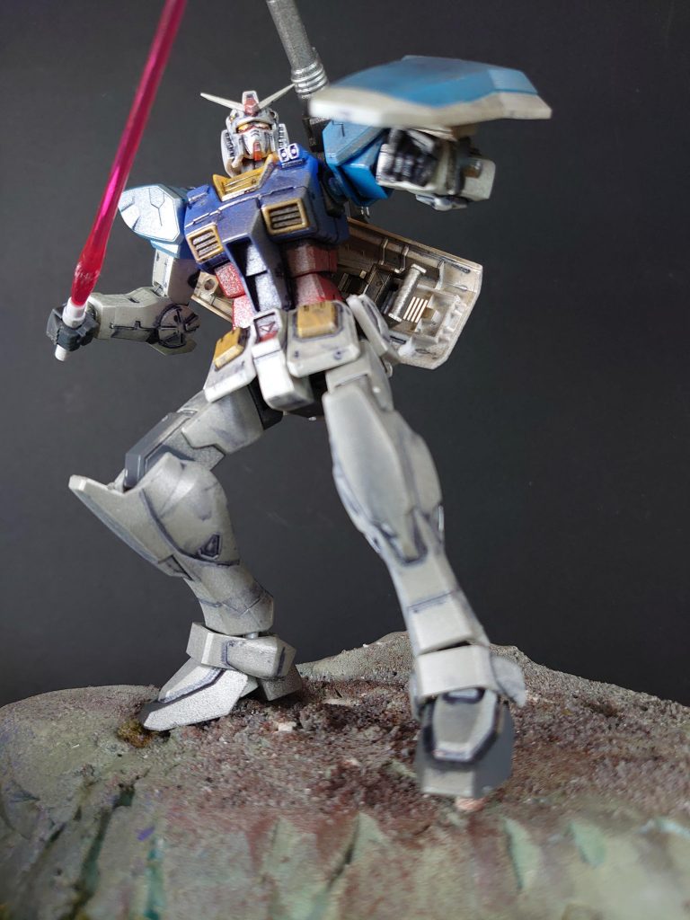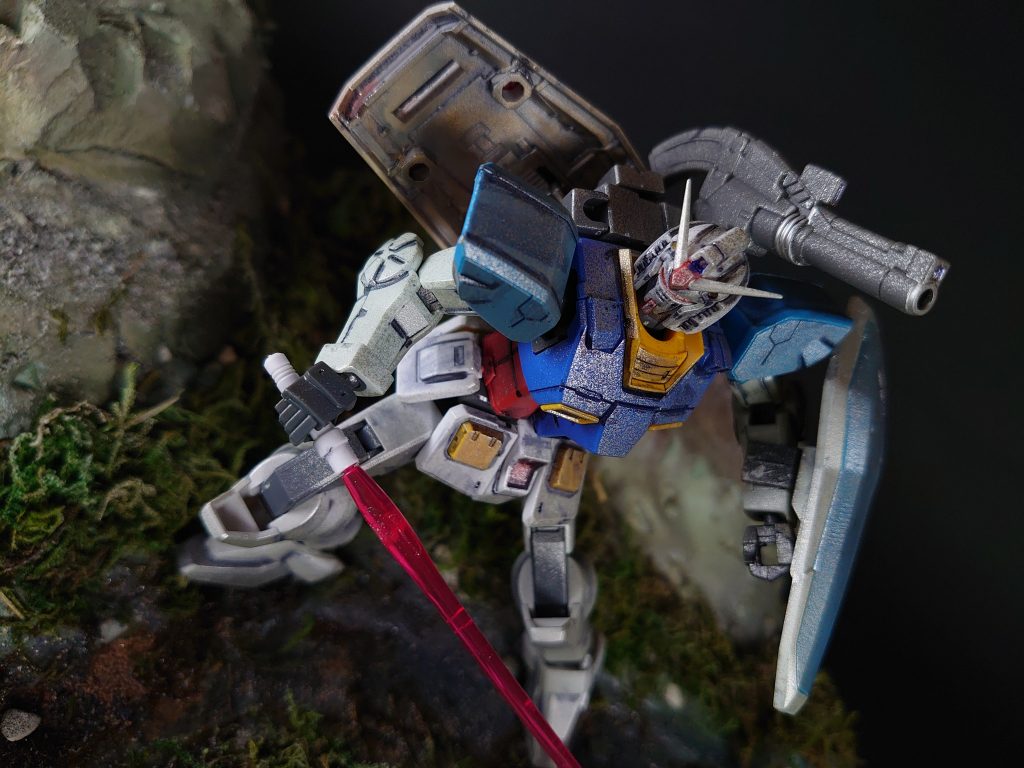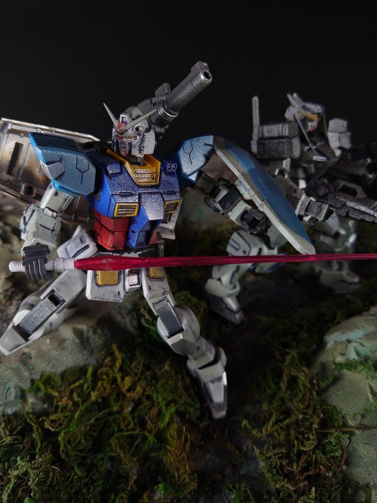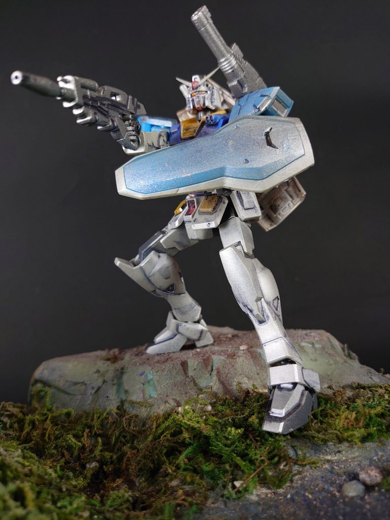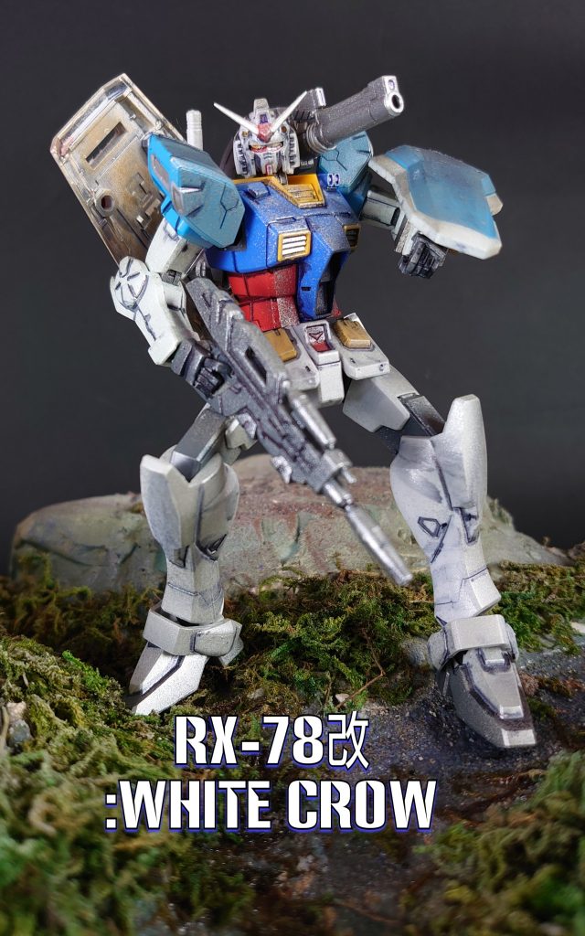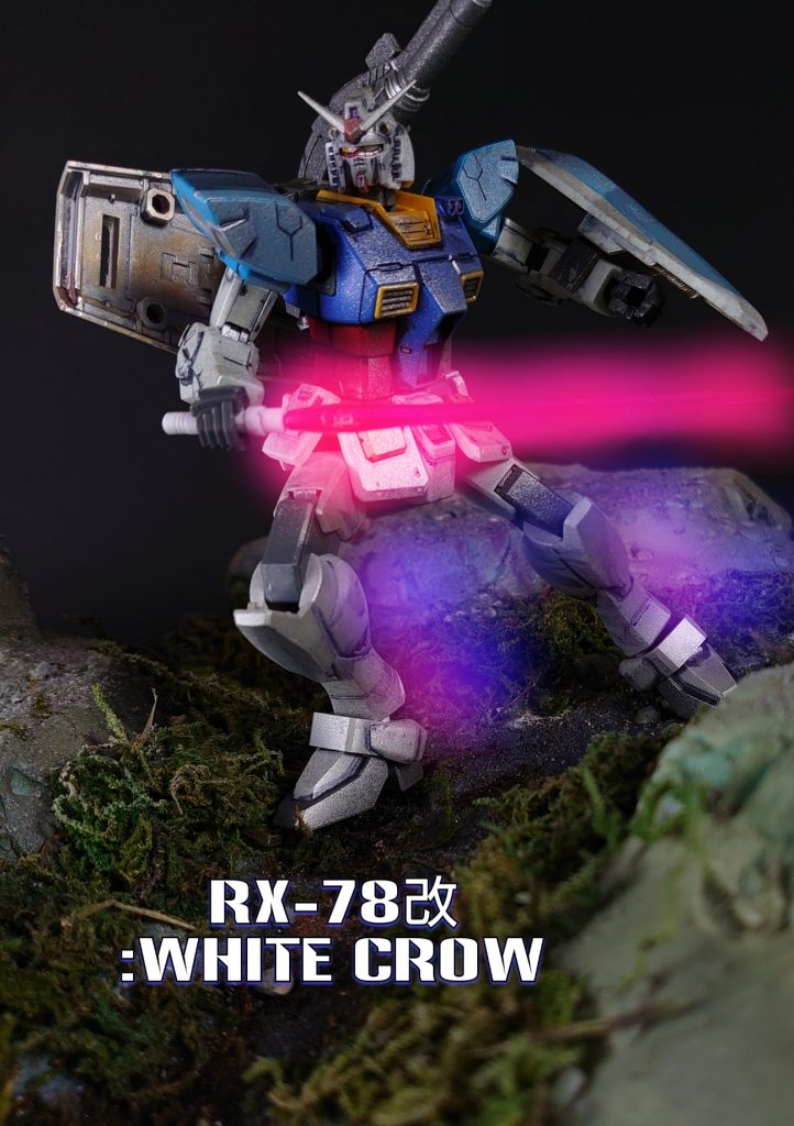 本機体は、RX-78改:White Crowである。ジオン軍MSを圧倒する性能を有する機体は、敵機の包囲網にかかる局面が増える。シールドを腕部と背部に装着し直撃被弾を防ぐ必要があった。冷静な状況判断ができるパイロットが搭乗し、戦地に切り込む。