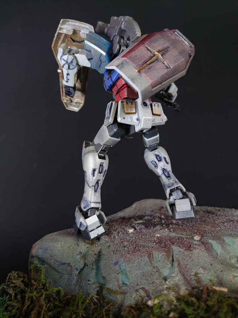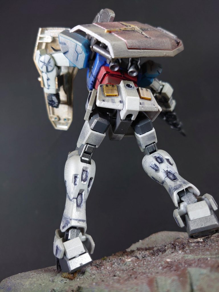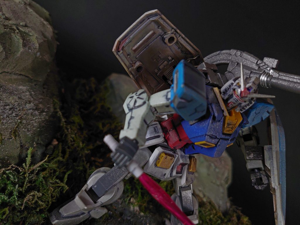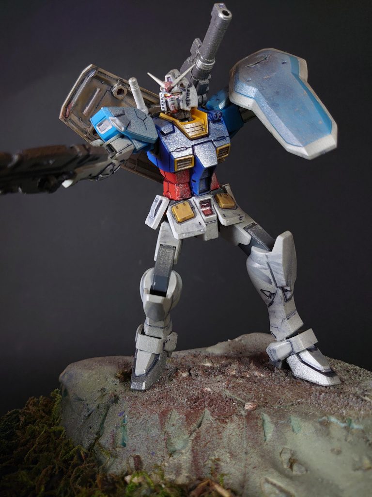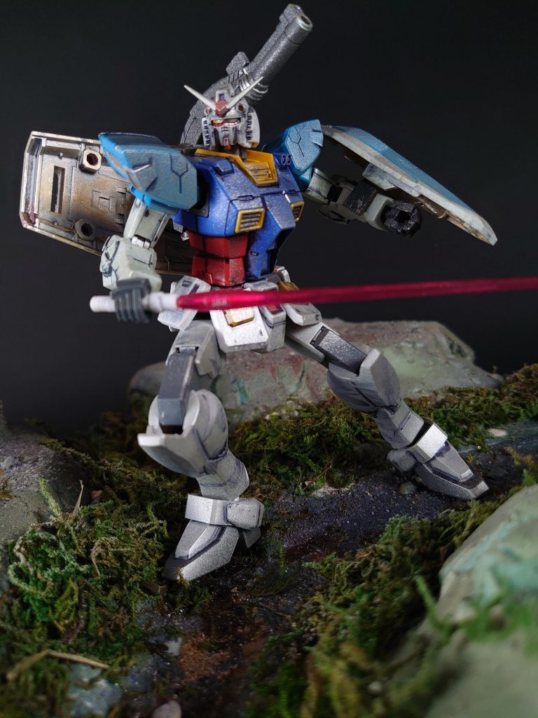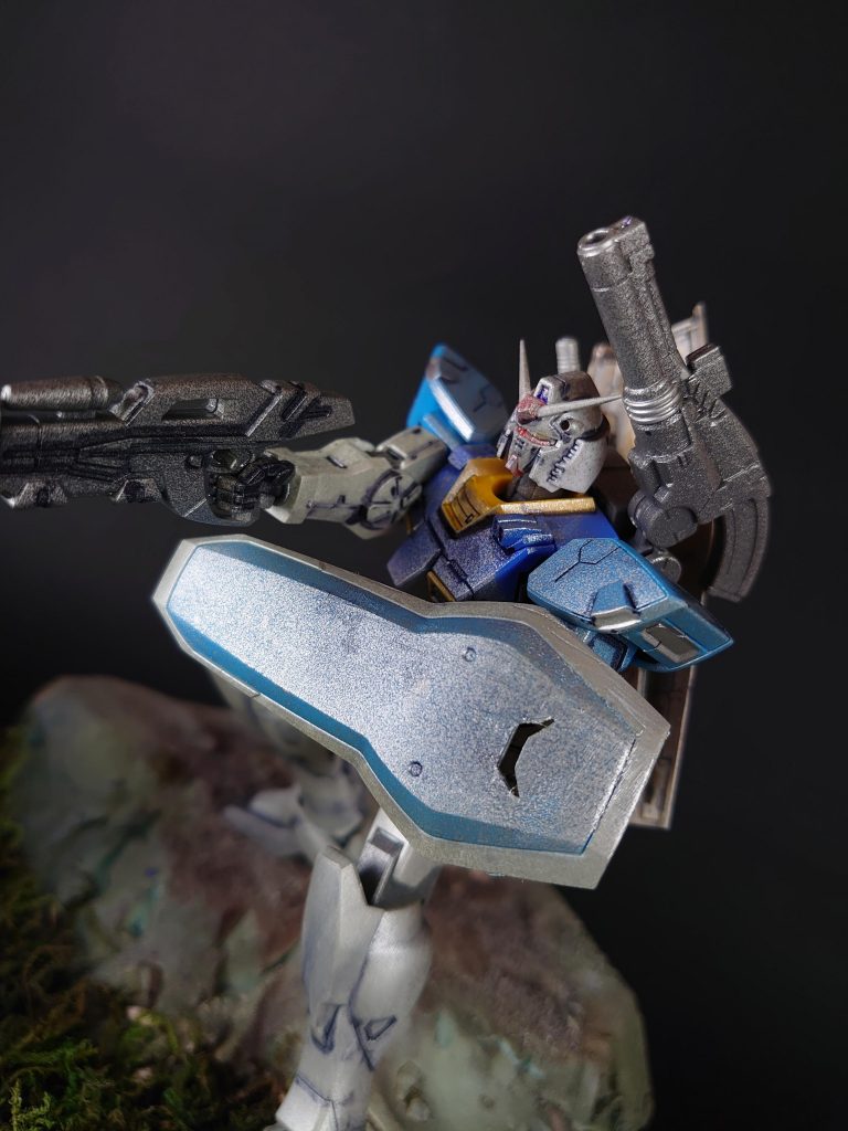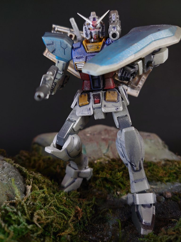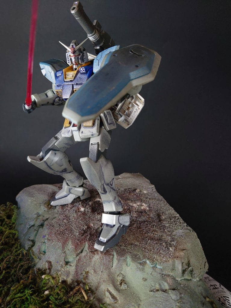 本機体は、RX-78改:White Crowである。ジオン軍MSを圧倒する性能を有する機体は、敵機の包囲網にかかる局面が増える。シールドを腕部と背部に装着し直撃被弾を防ぐ必要があった。冷静な状況判断ができるパイロットが搭乗し、戦地に切り込む。