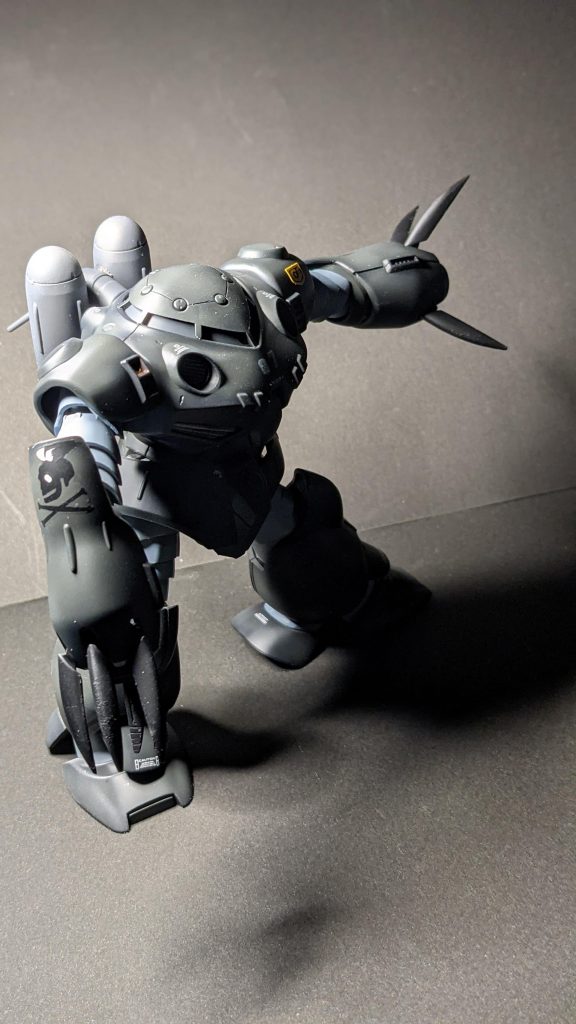 ジオンマークでも良かったのですが、塗装色を変えていますし、『過激派強襲部隊』の設定として、右腕の装甲には部隊章マークとしてドクロマークを貼りました。