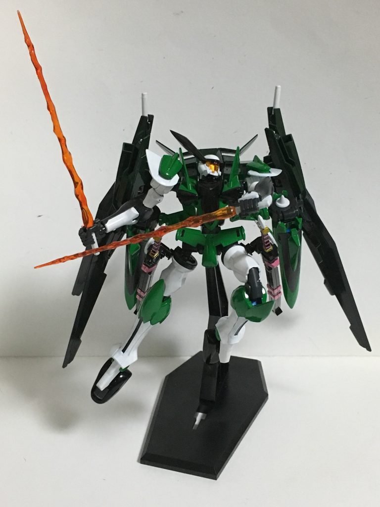 構えた画像はないですが“GNキャノン”左右のサイドバインダーに内蔵されたビーム砲で、ドレイクハウリングと併用して使うと「トライパニッシャー」が撃てる。