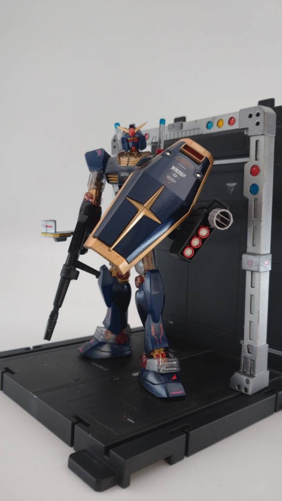 実は、バズーカ弾倉部の塗り分け/金属パーツもこっそりお気に入りです。この角度でシールドをみると「ORIXブルーウェーブ」カラーに見える(*´▽`*)大阪人としては懐かしいカラー!