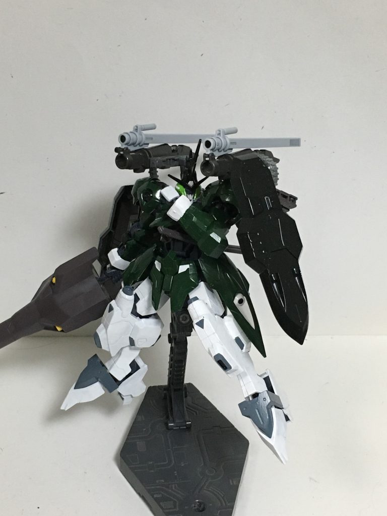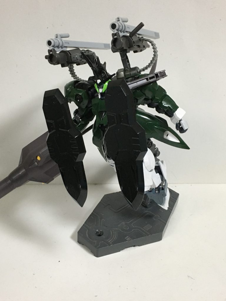 地上用グレイズのバックパックが余ってたのでそれを使ってシールドと今回の目玉であるレールガンを接続しました。そもそもレールガンはキマヴィダにつける予定はなく、基本装備だけでは味気なかったので何かないかと思っていたら、丁度このレールガンが目に入りました。と言ってもバックパックに装備しようにも、給弾ベルトをどう繋げようかと迷っていて、コトブキヤのアームのパーツを使って肩の上から構えることが実現しました。イメージはガンダムDXのサテライトキャノンです。
