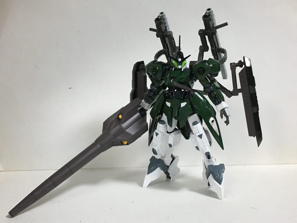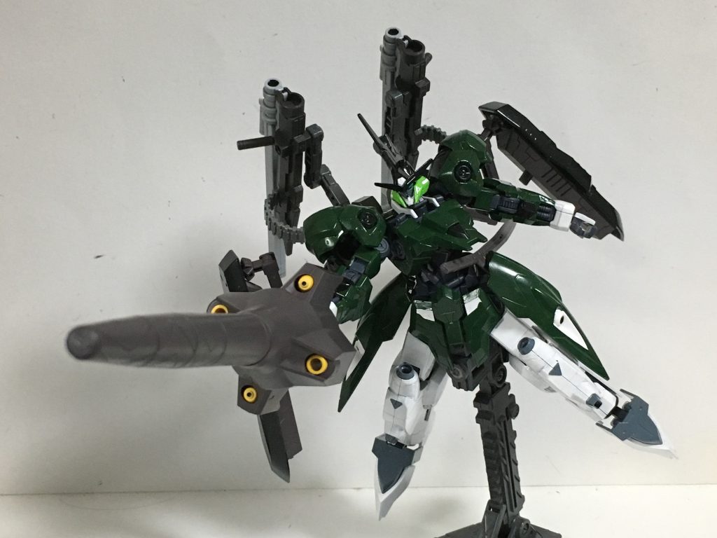 “長距離レールガン”元はレギンレイズ用の長距離用武装。バックパックに給弾ベルトとサブアームが連結しており、手を介さずに撃つことも可能。