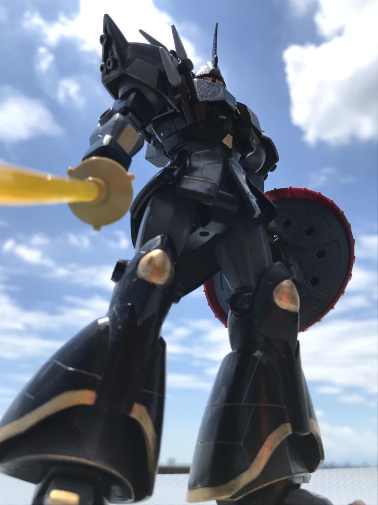 胸部アーマーは厚みが足りないと思い、プラ板で延長し、頭はギャンそのままだとカッコ悪いのでプラ板で加工しました。また、肩アーマーにヒートダートをつけるため、プラ棒でジョイントを作りました。