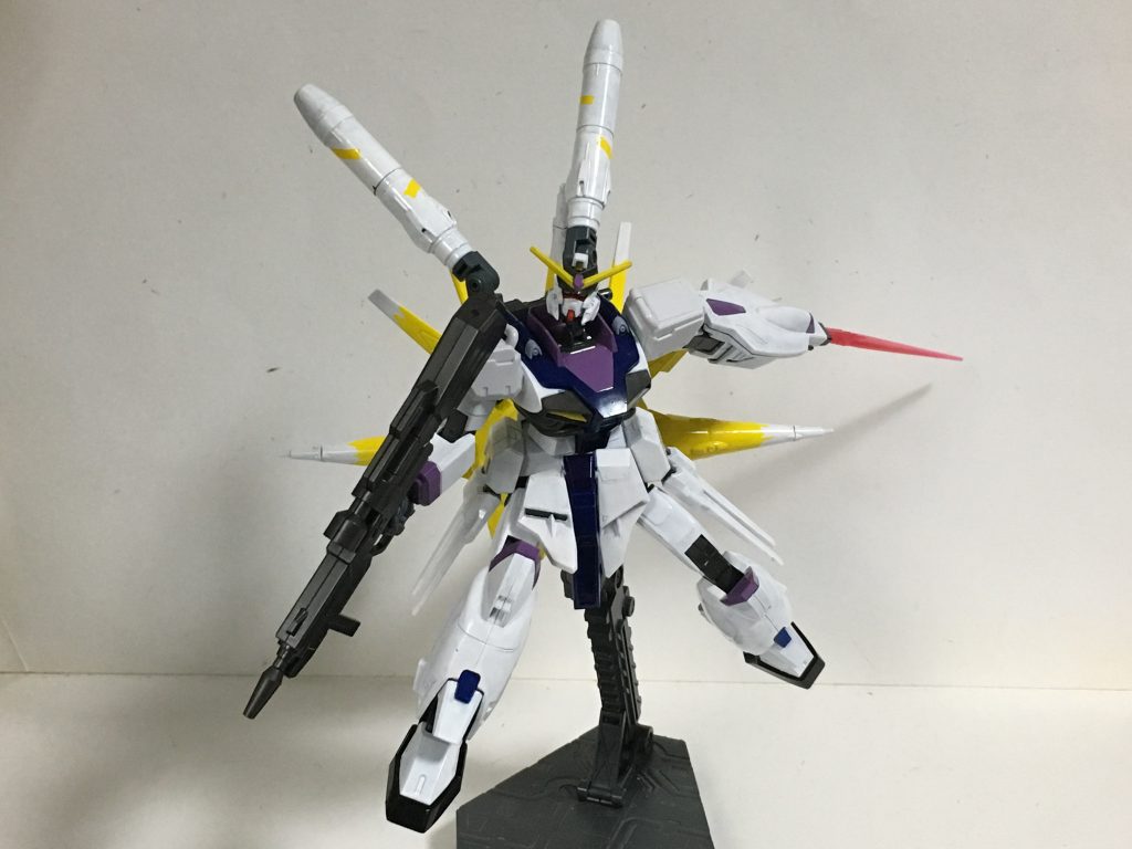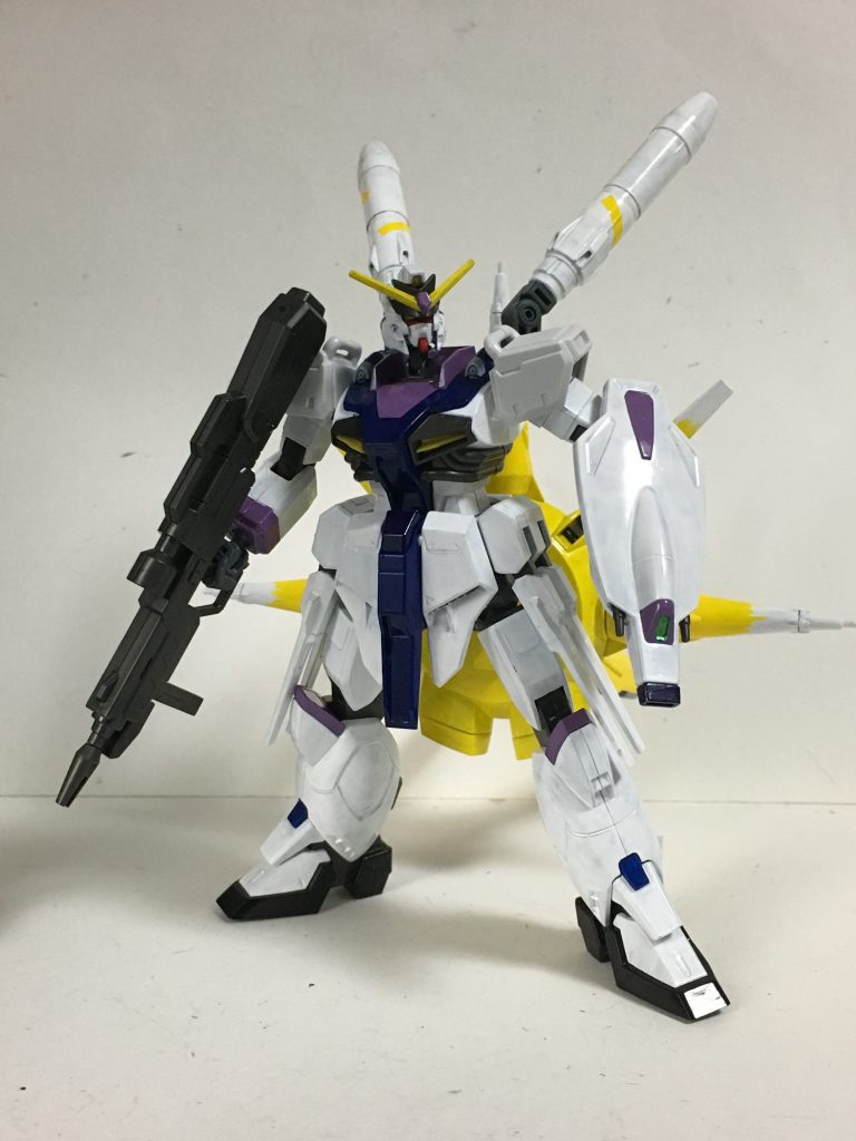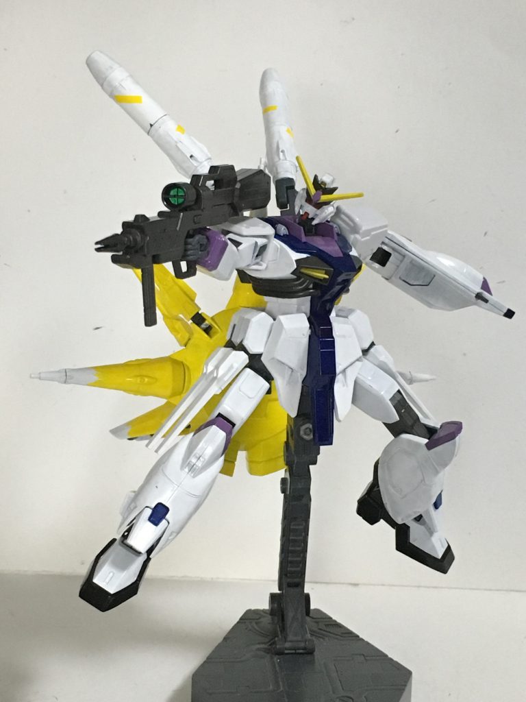 “高出力連装型ハイパーイグニッション”新たに開発された超出力型ビームライフル。通常のビームライフルと同様の威力だが、フルモードに移行すると戦艦並の威力を誇れる。更に紫のバスターライフルと合体可能で更に倍の威力で打つ事も可能となった。