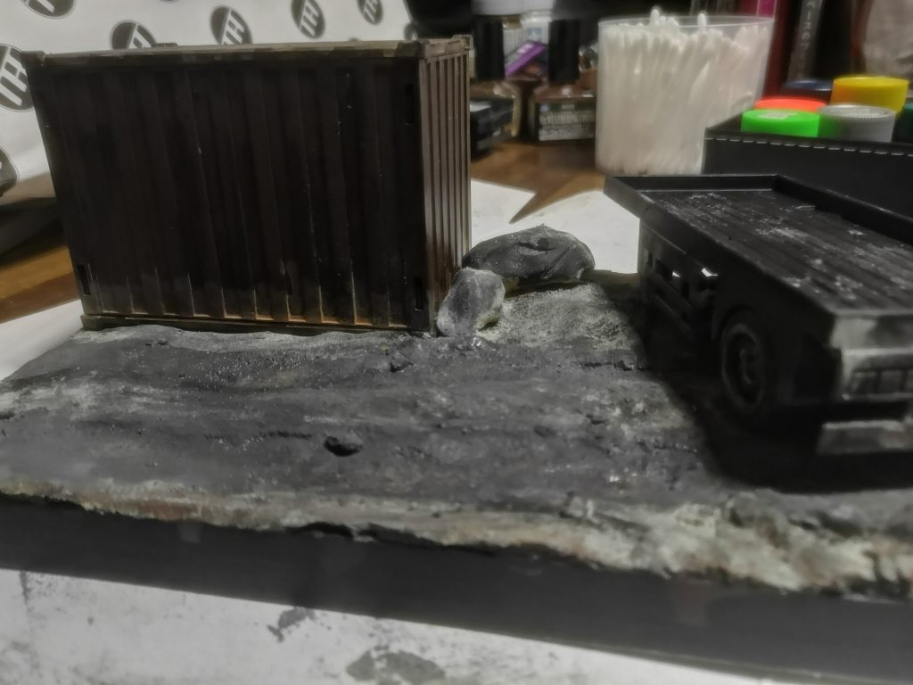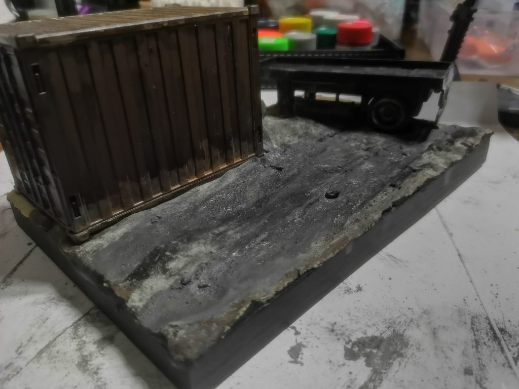 「簡易前線拠点」をテーマに汚れたコンテナと荷台、轍の残る荒れた路面を表現しました。