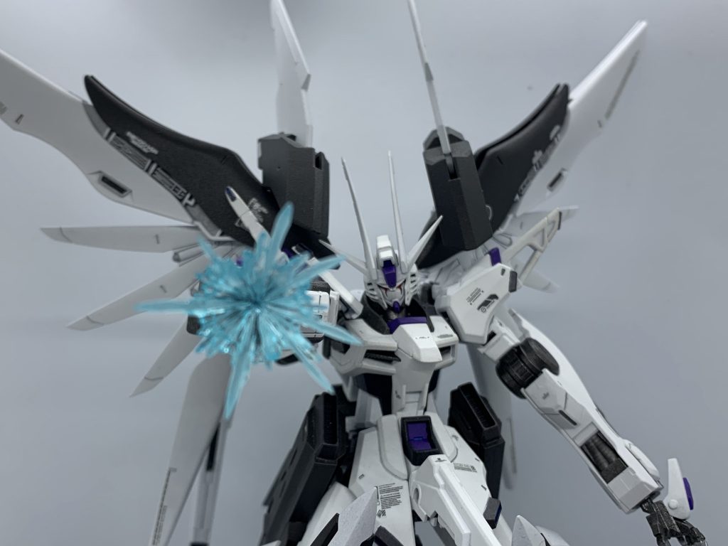 戦場で普及の陰りを見せてきたビームシールドに対抗するための武装。普段は掌から発射されるビームガンやビームサーベルとして使用し、最大出力・収束時には全長13Kmを超える光の刃と化して空間干渉を引き起こし、ビームシールドを突破するしかしMSのマニュピレーター及び関節の集中する腕部にこれほどのビーム砲を搭載したことにより最大出力での連続使用は行えず(通常のビームライフル程度の出力であれば150発までの連続使用は可能)、最大出力継続時間13秒フラットには腕部機能のほとんどが使用不能になる。また、高性能化と加速レールの延長に伴い腕部は大型化している。(掌はあくまで加速リングであり、発生器自体は腕内部にあるので手首から先は変わっていない)