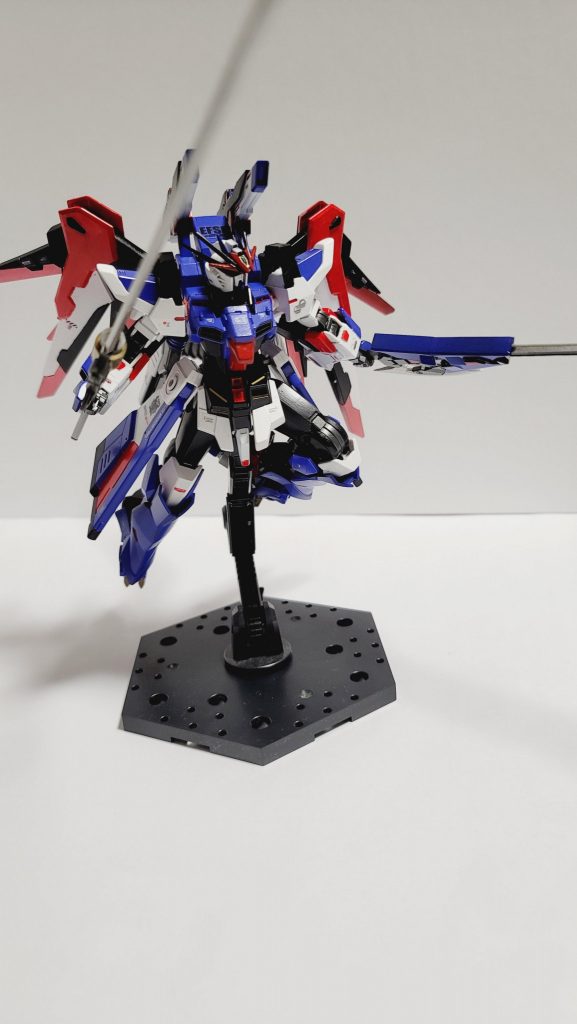 ベースはアメイジングストライクフリーダムで、武装は 太刀ⅹ2 ソードⅹ2(持ち手がお釈迦になったので写真はなし) アサルトライフルⅹ2 腕部ビームソードⅹ2 ビームサーベルⅹ2 腰部レールガンⅹ2 背部レールガンⅹ2 テールブレードとなっております。