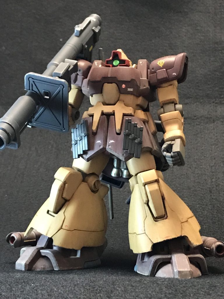 襟を塗り忘れてて慌てて塗ったときのマスキングでデカールが持っていかれたりしておりますが使用感と片付けてスルー。武装は以前ゲラザクを作った時に完成させていたものを少佐から奪回。今回の作品に合わせて少しだけシルバーでドライブラシ。