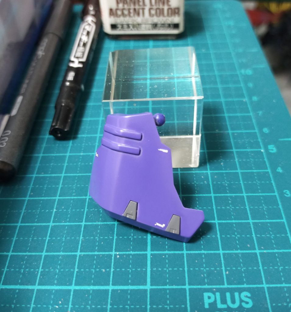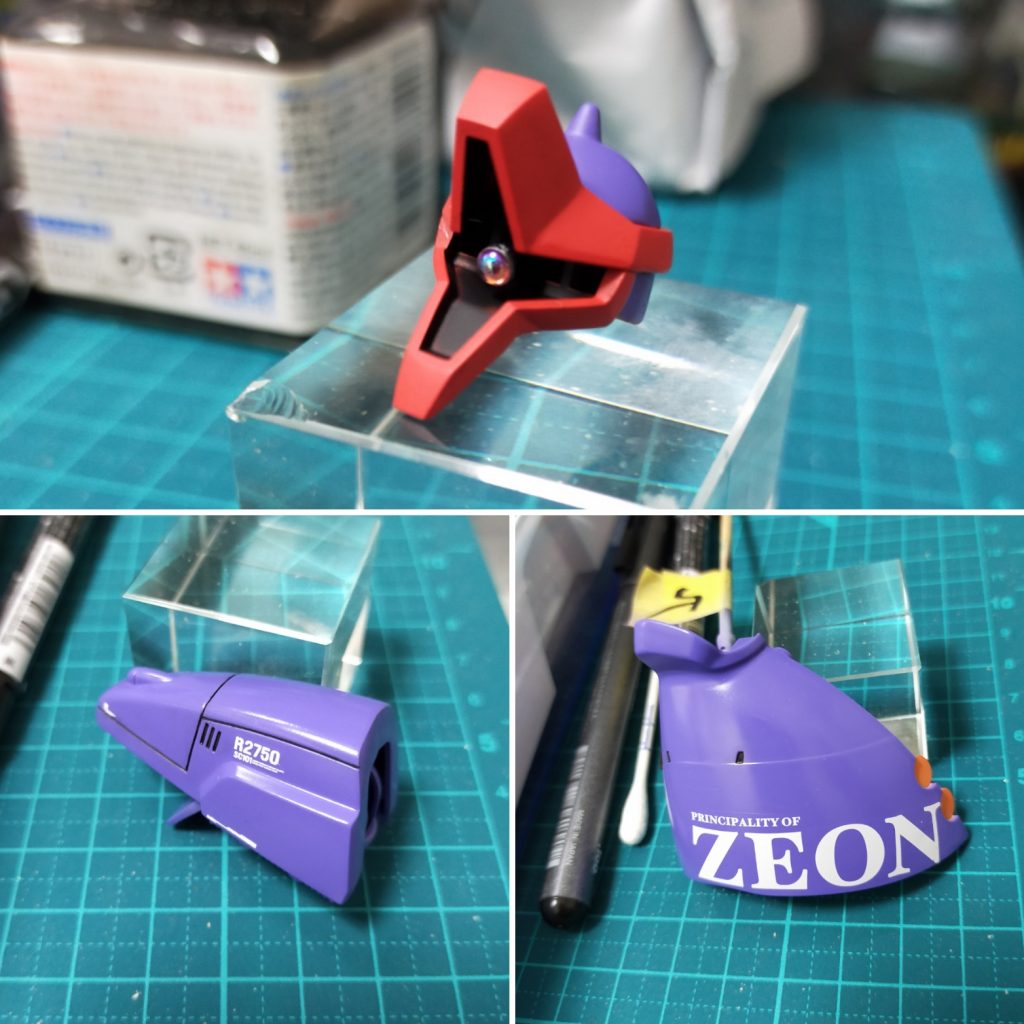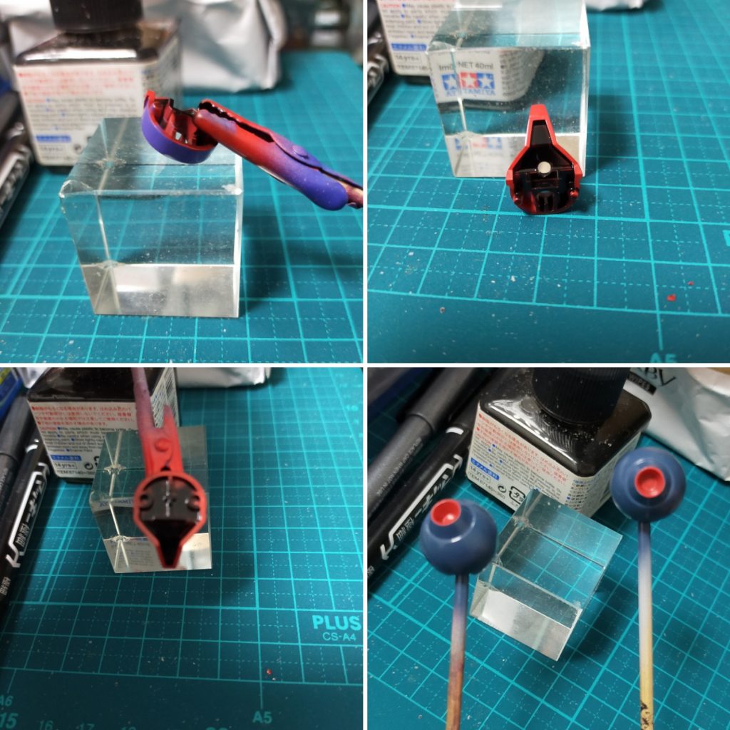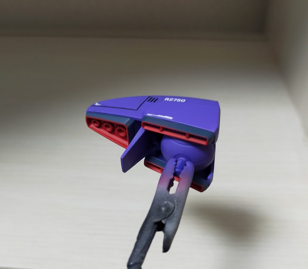 頭部の赤い部分と紫部分を塗ってから内側を黒のエナメル塗装をし、乾燥後にエナメル溶剤で拭き取り