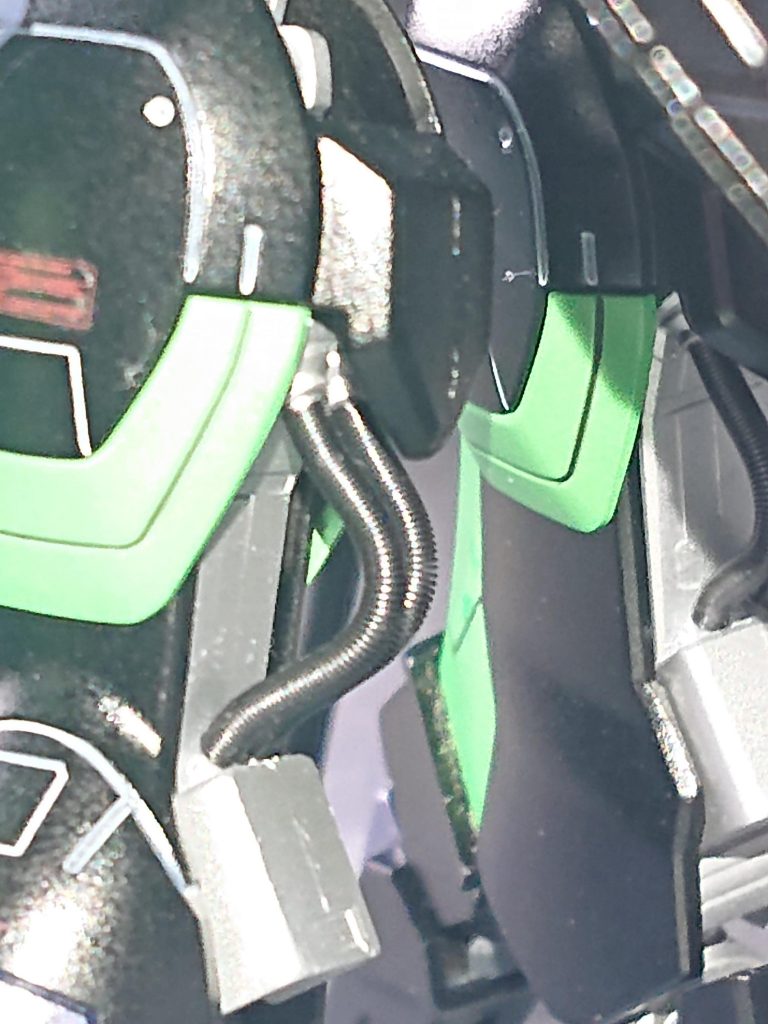 カラーは職場の先輩の助言でバイクのカワサキカラーにしてみました。墨入れはカラーごとに変えていて、シルバーと蛍光グリーンには黒。黒の塗装にはエナメルホワイトを使っています。