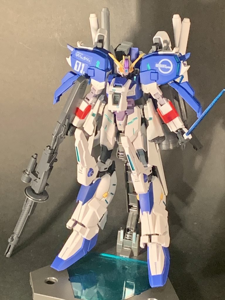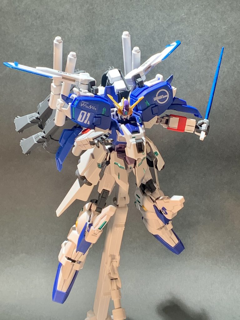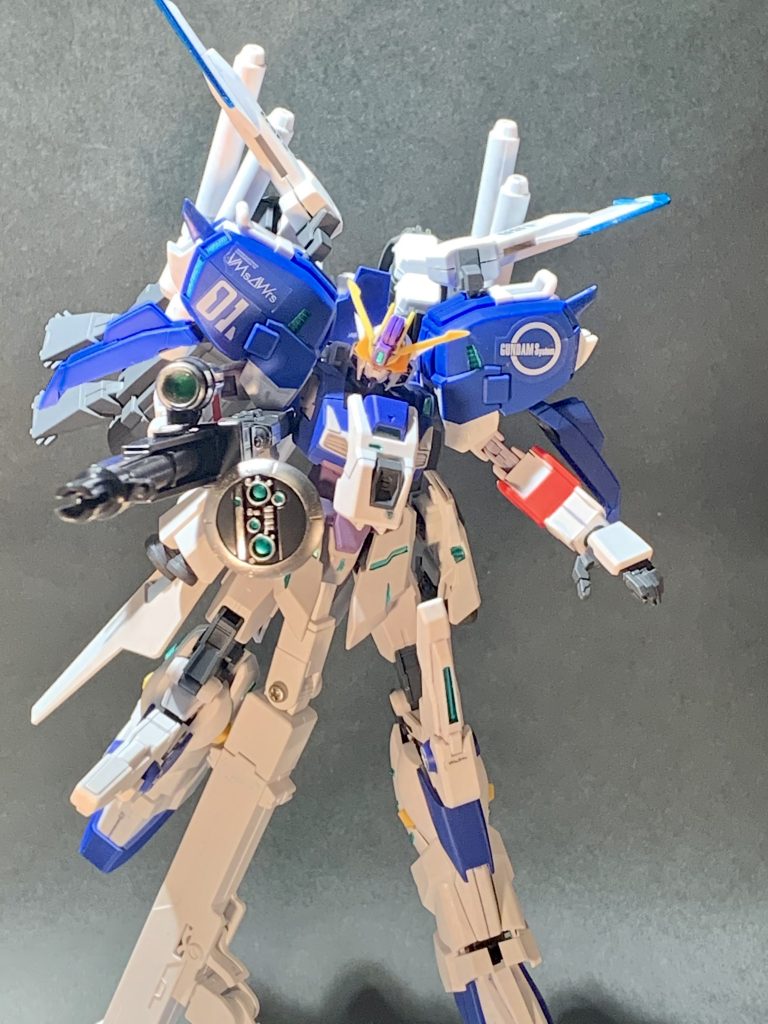 オリジナルアーマーを作るときは、膝部分の細さをいかに誤魔化すかがポイントだと思っています。足の接続を深めに加工すればいいのですが、今回はリフレクターインコムと腰サイドにつけたリゼルC型の腰部スラスターで見栄えを調整したつもり。本来なら、EX-Sのビームガンやスマートガン用のアームがつきますが、バランスがよくなかったのでオミットしました。その分、オリジナルよりも機動性が向上しています。