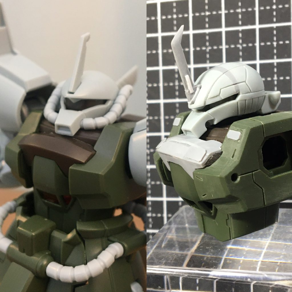ツノは新設、目つきを鋭くする加工を行い、全体的にスジ彫りやプラ板にて情報量を上げました。