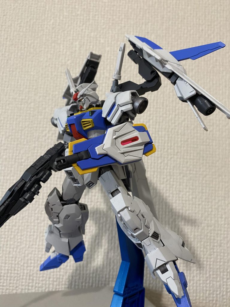 バーニアを肩や脚部に増設し、バックパックには武装を担ぐランドセルから大型スラスターを新たに装備した事により機動力を底上げした。肩のバーニアは可動範囲を狭める事なく上下に動かせられるように加工しました。