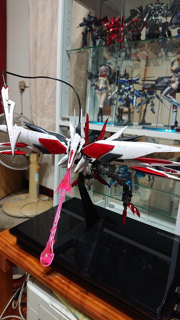赤い部分はガンダムマーカーロイヤルメタレッド、ワイヤーブレードはガンダムマーカーベビーガンメタリックを使用。本体は無塗装です。