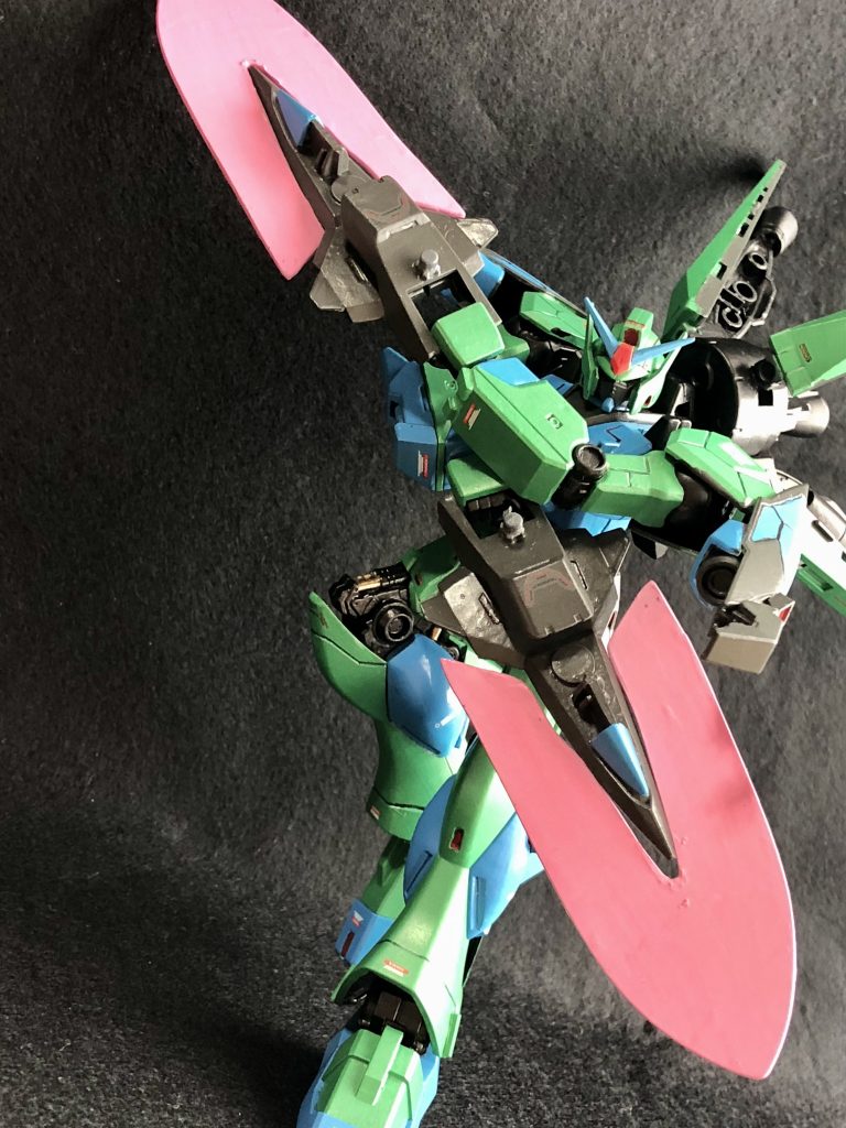 脳内設定として、ファンネルの操作までは行えないものの、ある程度のサイコミュ操作が可能な「ニュータイプのなりそこない」パイロットが性能実証テストの為に、このあり合わせの機体でネオジオン残党迎撃任務へあたる事になる…みたいなやつです。目視での誤認を狙ったジェガン風カラー