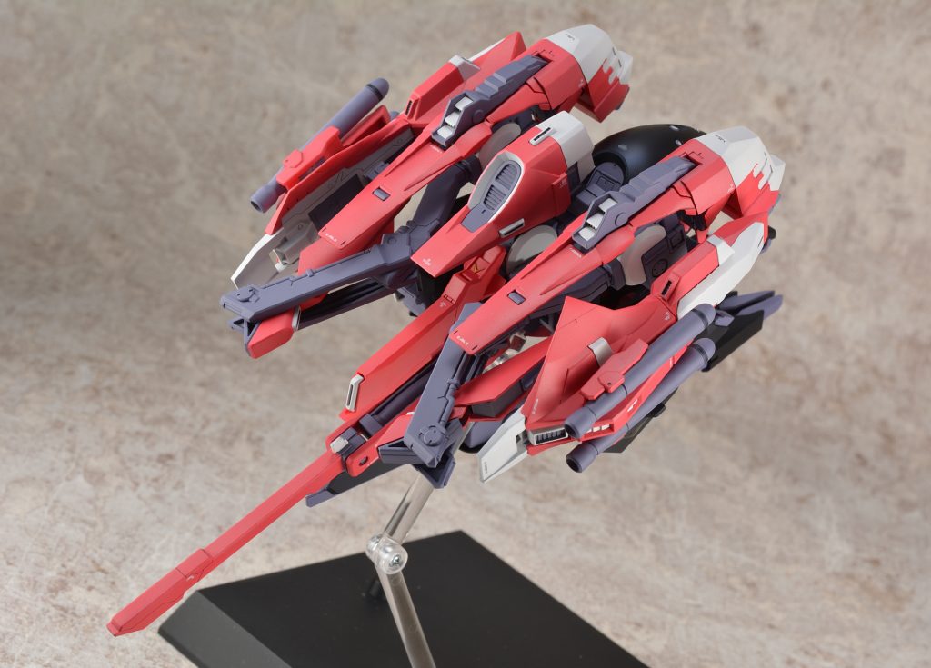 HGのウーンドウォート・ラーは肩に補助パーツを追加してフルドドⅡを保持していますが、可動範囲が大幅に制限されるので背中のブーストポッドを介して接続できるようにしました。