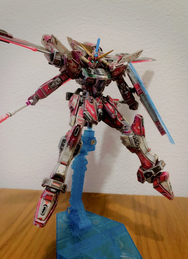 デスティニーとはまた違う表現をしたいと思い、ウェザリングカラー・マルチホワイトで全体を軽くウォッシング。その上から水性アクリジョンやガンダムマーカー・シャインシルバーを使って全体をチッピング。ハイライト的な効果を期待して入れてみました。