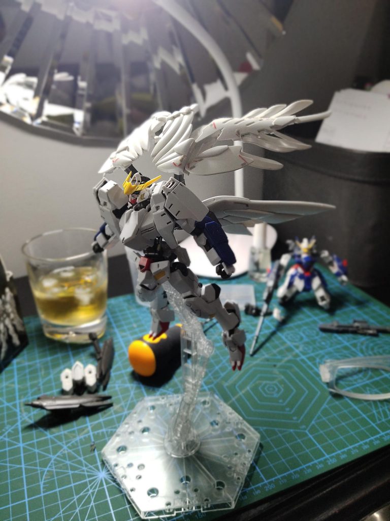 I used the backpack of Astaroth and drilled two additional 3mm holes to be able to connect four pegs. I used Kotobukiya MSG joints and connectors to hold the the two pairs of wings together. Sacrificed two units of RG Gundam Wing Zero EW.