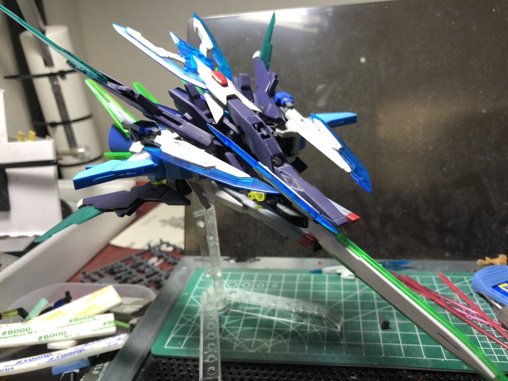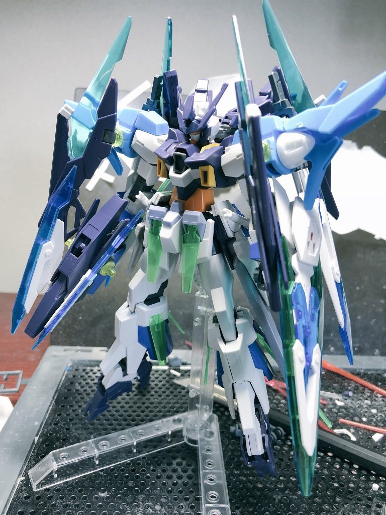 最初は剣を2、3本追加した近接使用のAGE2にしようと思ってたんですが、思いついたアイデアをどんどん詰め込んでいったらいつのまにか武装てんこ盛りになってました。 それでもなんとか変形できる形にまとめられたのでよかったです。 エフェクトもりもりのバーストモードは自分でも気に入っています。