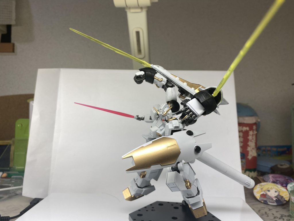 ビームサーベルはシナンジュの腕に収納されているのが2個、腰にマウントしているのが一つ、左足のジムの腕の近くに一つあります。