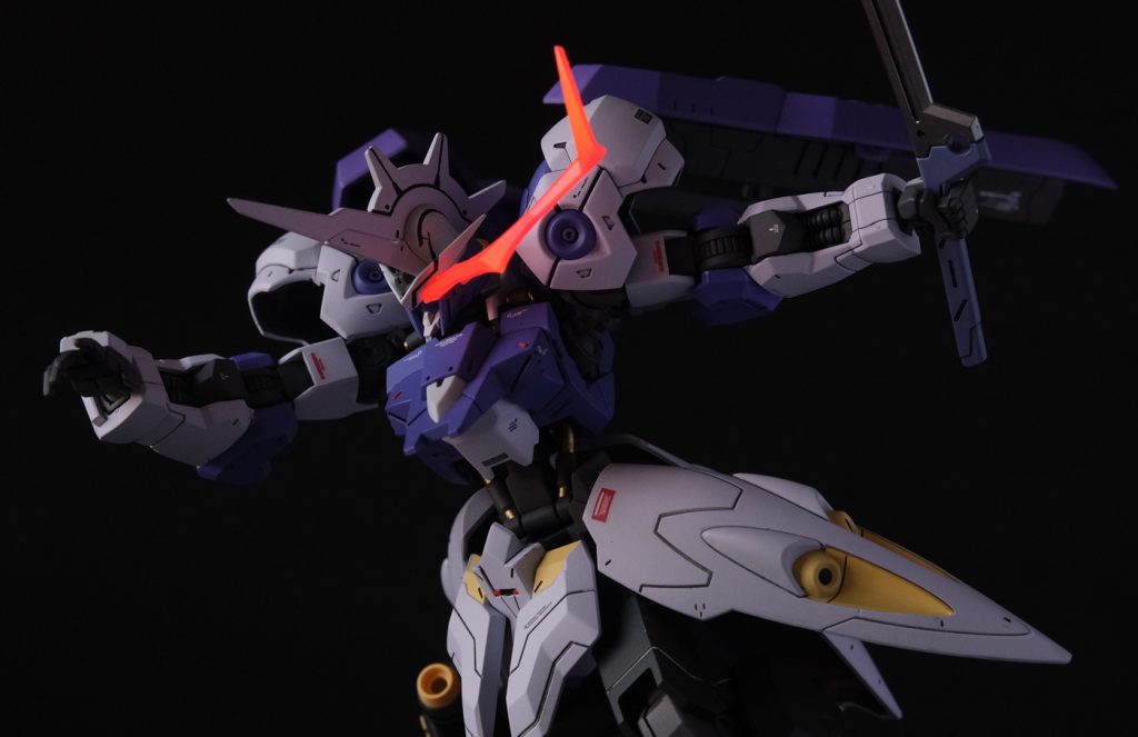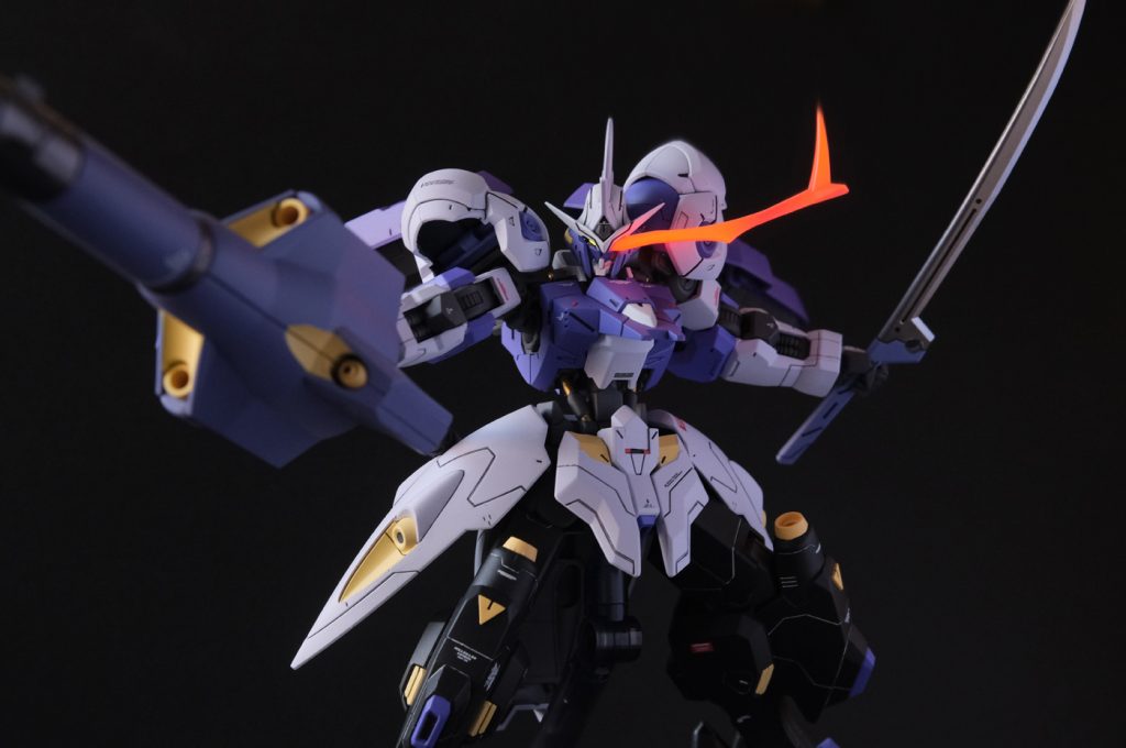 合わせ目を適度に処理しつつ、腰アーマーの幅詰めとドリルランスの突起追加、刀のマウント位置を変えたり、眼光エフェクトを追加してみました。