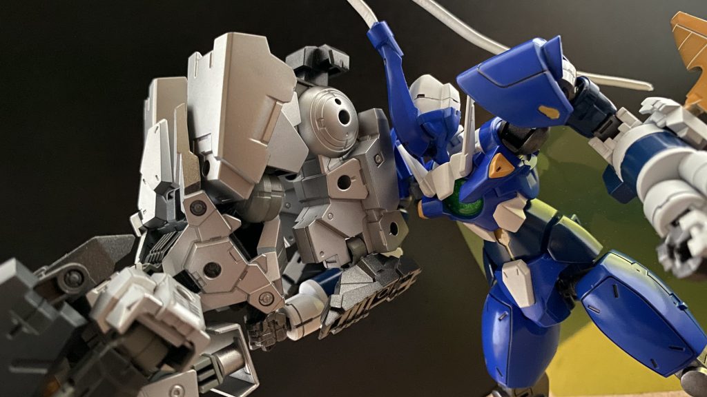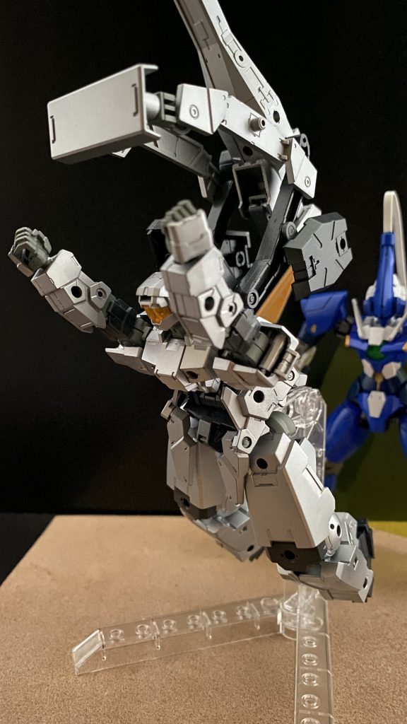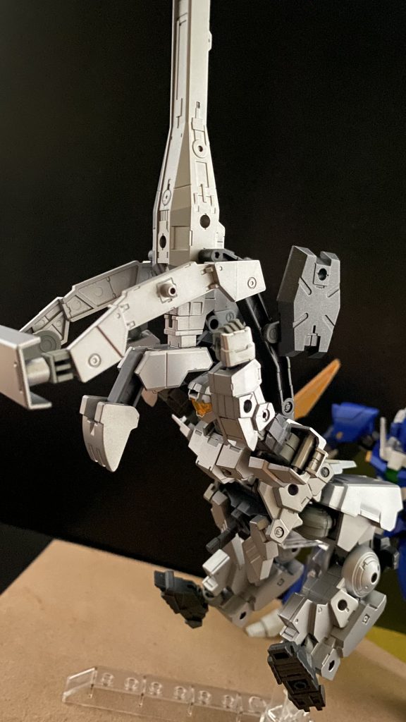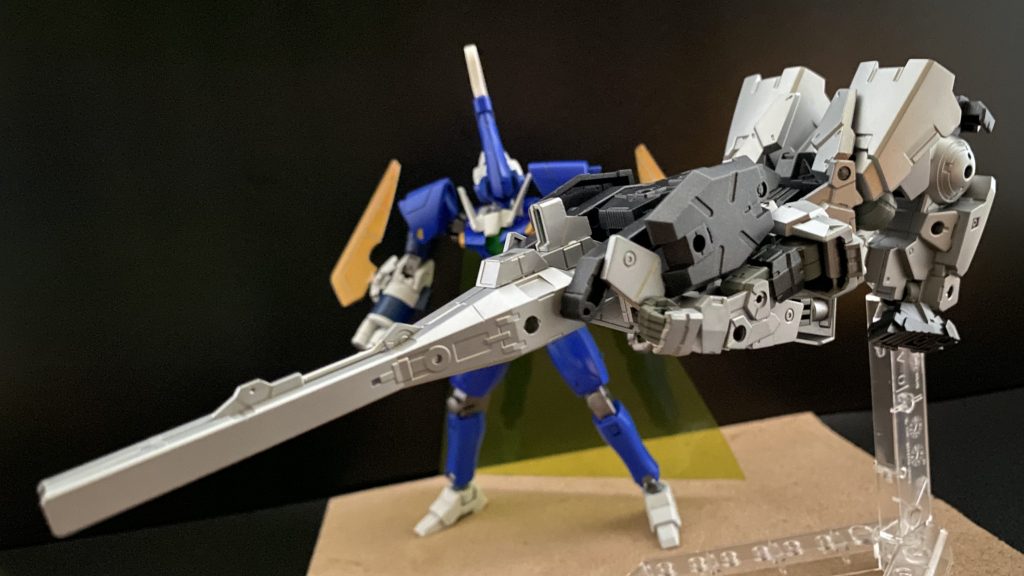 太腿内に換装用の銃身が内蔵される設定。展開された太腿正面装甲の内側に、換装用の銃身が担架されており、ガンマンの抜き撃ちのようなモーションで換装される。