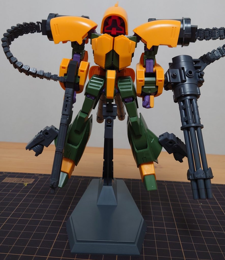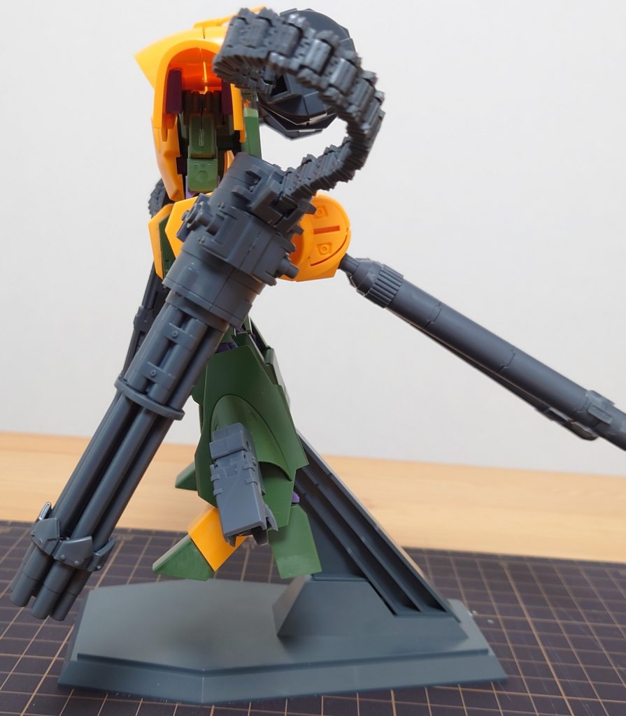 武装は元々の大型ビーム・ライフルに加え、システムウェポンキット002のビーム・ライフル、MSGのガトリングガンを装着。給弾用に同じくMSGのベルトリンクを2つ取り付けて火力マシマシ殲滅仕様です。
