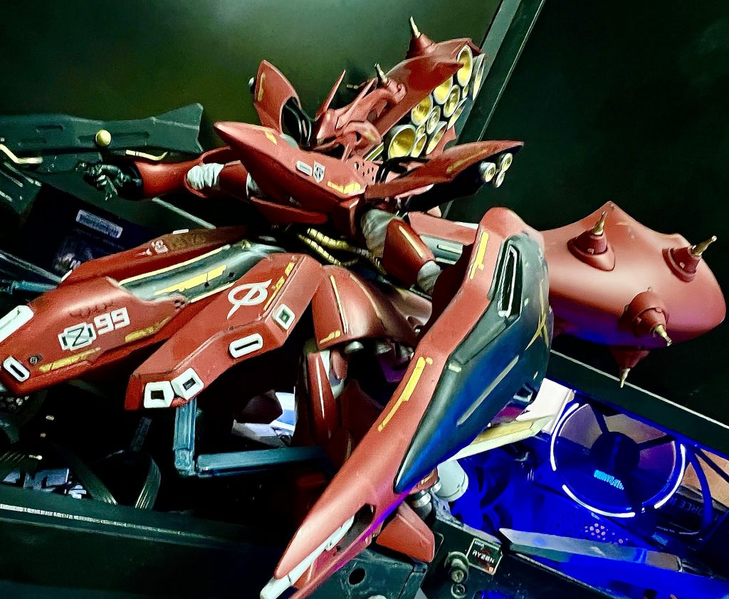 HGUC ナイチンゲールにメタルバーニア、バーニア追加、デカール、部分塗装&本体成形色+クリアで仕上げ。シャア最後の機体ということで、赤だけではなく、百式の金色も意識して入れてみた。