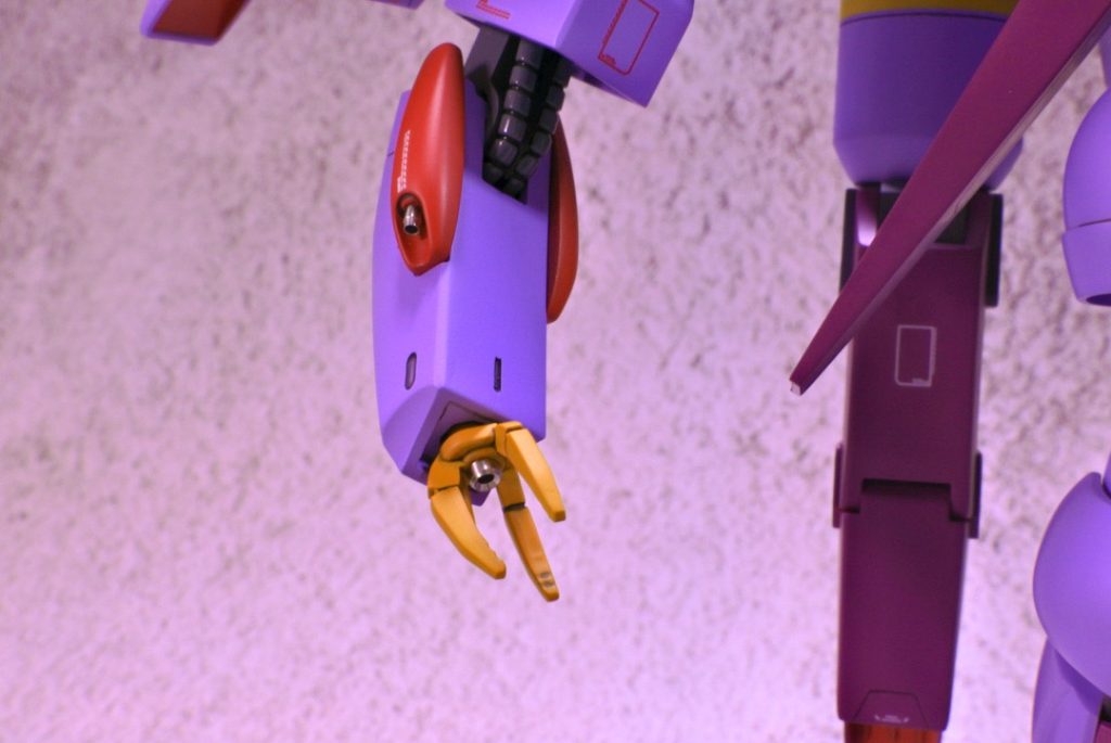 ・前腕両サイドの赤色パーツはクレオス瞬間接着パテで肉抜き穴埋め、併せて前方モールド部分をピンバイスで開口し、HI-Qパーツのガンマズルレギュラー1.5mmを取付け、ディテールアップ