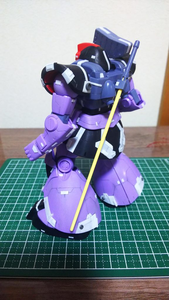 スカート後方と裾のプラバンのデザインがカッコいいですね✨一部濃くしてある紫と差し色の黄色がきれいです( ≧∀≦)ノ。スジボリの太さも均一でファショナブルで無骨なドムに仕上がっていますね。なんだか私があれこれ言うのがおこがましい出来です\(_ _)