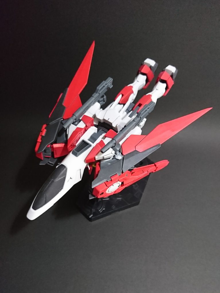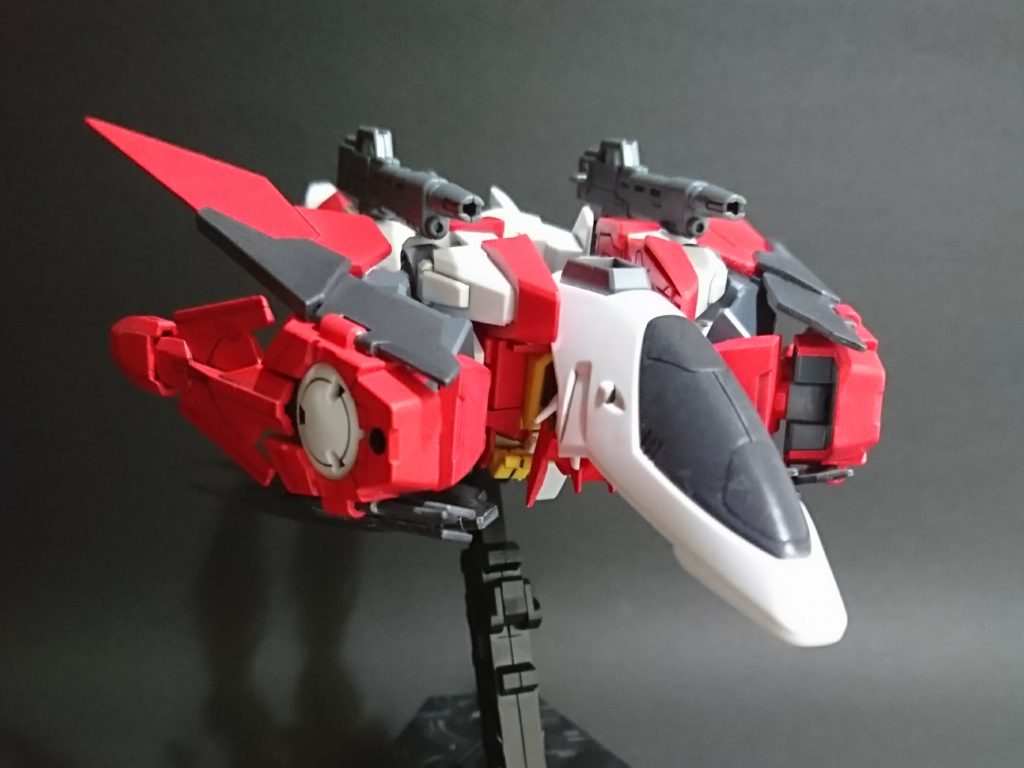 コンセプトはダブルオーダイバーの変形機です。ベースはダブルオーダイバーに、リナーシタ、エアマスターのパーツを入れて改造しました。太陽炉、バックパック周りを機動力向上のパーツを入れました。等身を少し上げる為に足首のパーツを追加。アンクルアーマーを装備。腕はOガンダムのものです。主な武装はシンプルにライフル、サーベルにしました。変形だけでなく、ビームマントでも個性を出しています。胸部のリナーシタの爪パーツはグラビカルアンテナと想定して取り付けています。