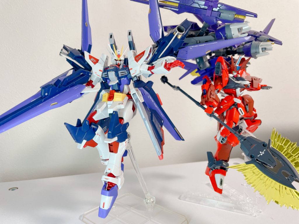 HGインフィニットジャスティスは非常に完成度の高いガンプラだったので、どこを改造するか非常に悩みましたが、使えそうなパーツを日々探し、モチーフが決まってから一気に仕上げました!
