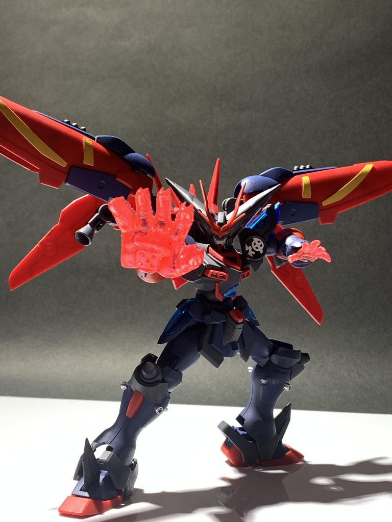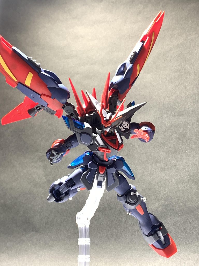 当初はマントを広げた形態を取れるようにしたかったのですが、技術が足りず断念。かわりにウイングの稼働をバトルアームズのジョイントに変更、内部にスラスターを配置して元のマスターガンダムより機動性が高くなっているという設定に変更しました。