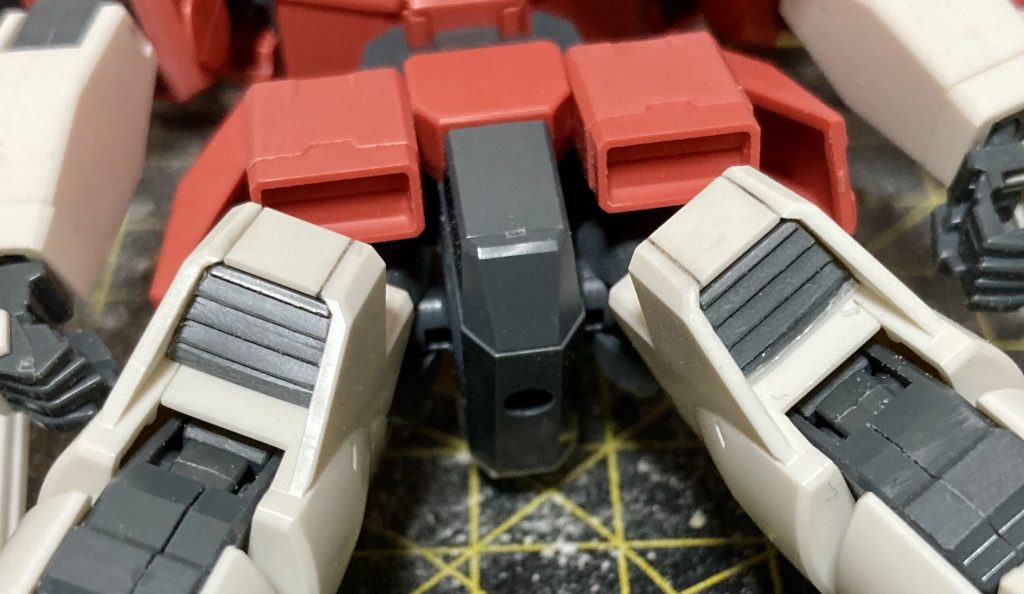 二の腕についてたスラスターパーツを肩の位置に変更、その際に出た余剰パーツを太もものディテールアップに使用。