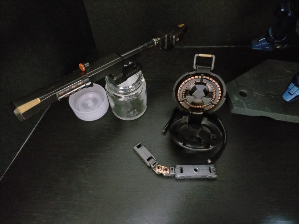 工作の段階でhgacのレビューや先人達の工作を参考にしましたが、ビームキャノンのマウントには、バトルアームアームズ?だったかな(笑)のアームをまるまる流用しました!ワンポイントでクランク部分はコッパーで塗分けしました。